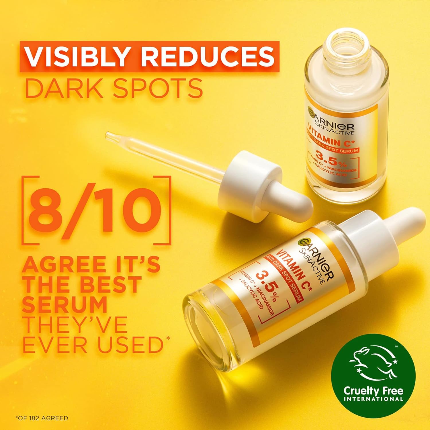 Cleanse your skin with our gentle Vitamin C Brightening Micellar Water. Remove up to 100 Percent of make-up and intensely cleanse skin of dirt, oil, SPF, pollution and dead skin cells – all in one step. Our formula combines Micelle Technology with a powerful antioxidant, Vitamin C. Skin is left soothed, healthy-looking and free of impurities. Our micellar water also helps to brighten and even out skin. On cleansed skin, apply our 3.5 Percent Vitamin C, Niacinamide and Salicylic Acid Serum. Our Anti-Dark Spot and Brightening Serum visibly reduces the appearance of dark spots and enhances glow. Enriched with Lemon Extract, a powerful superfood well known for its brightening properties, the formula has been carefully blended to provide dark-spot action. Our serum is non-oily, non-sticky, sinks in quickly and doesn’t leave a visible residue on the skin. The box and bottle are recyclable and the bottle is made from 40 Percent recycled glass and is UV protected to help protect the stability of our Vitamin C. Pamper your skin weekly with our Vitamin C Sheet Mask, enriched with Vitamin C and Hyaluronic Acid to give your skin a fast glow up. In just 15 minutes: skin is intensely rehydrated and feels smoother. After 1 week complexion looks more even and brighter. Signs of tiredness appear reduced and skin looks revitalised. Vitamin C derivative All Garnier products globally are officially approved by Cruelty-Free International under the Leaping Bunny Programme, the leading organisation working to end animal testing worldwide, and the recognised Cruelty Free Gold Standard.