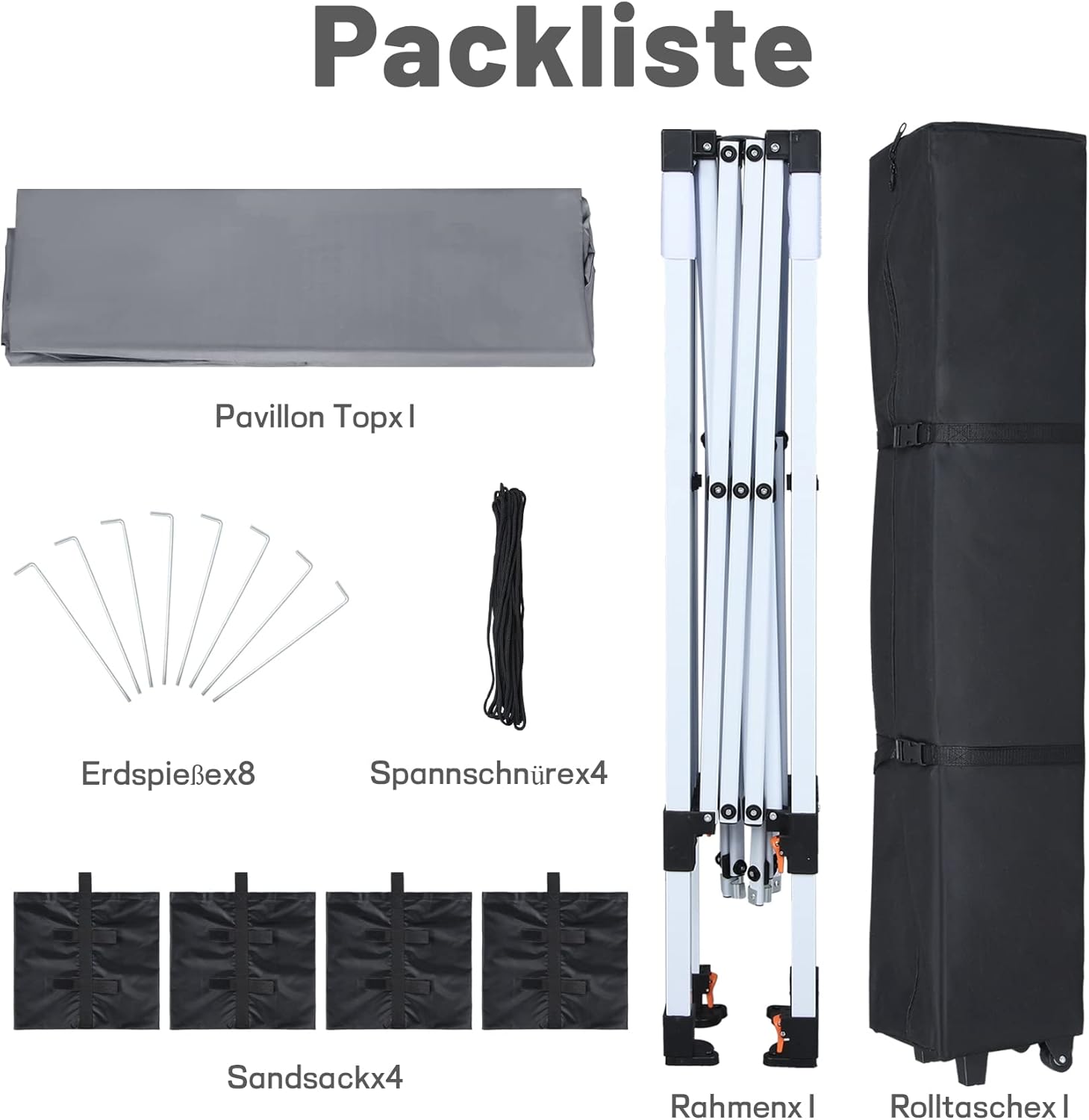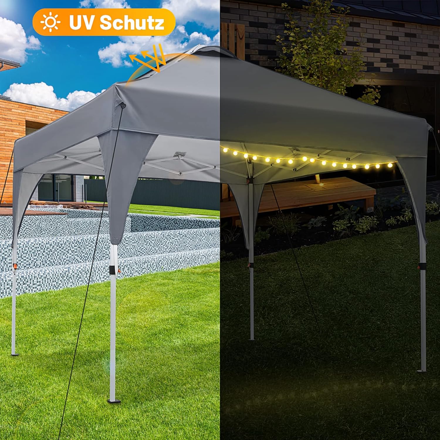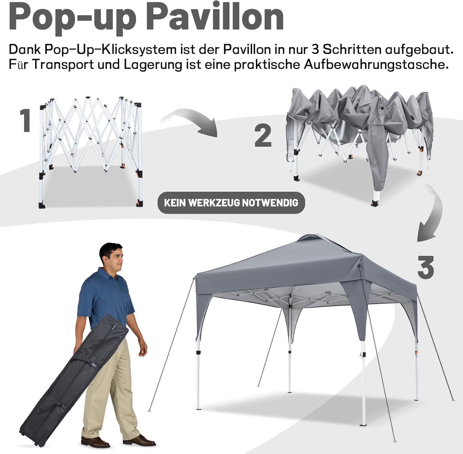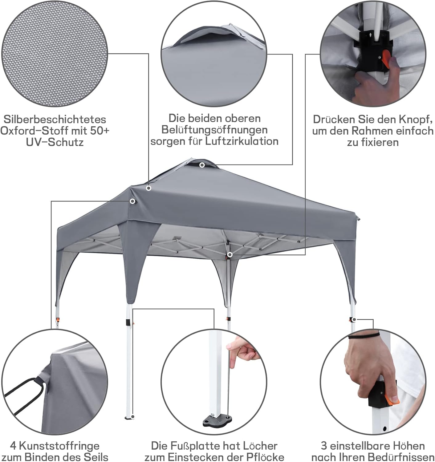Convenient Leg Height Adjuster – This pop up gazebo 2.5 x 2.5 can be set up in 3 height levels (252cm/261cm/270cm). Just press the orange buttons and push them to the right height position as you wish.