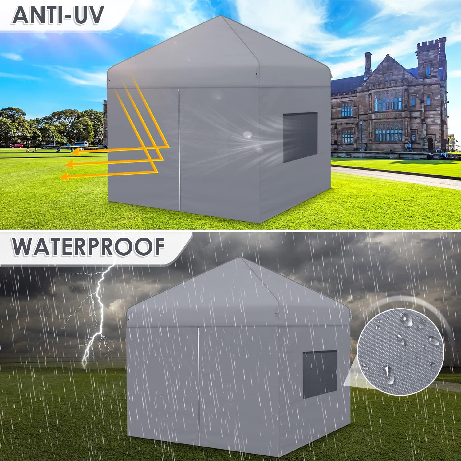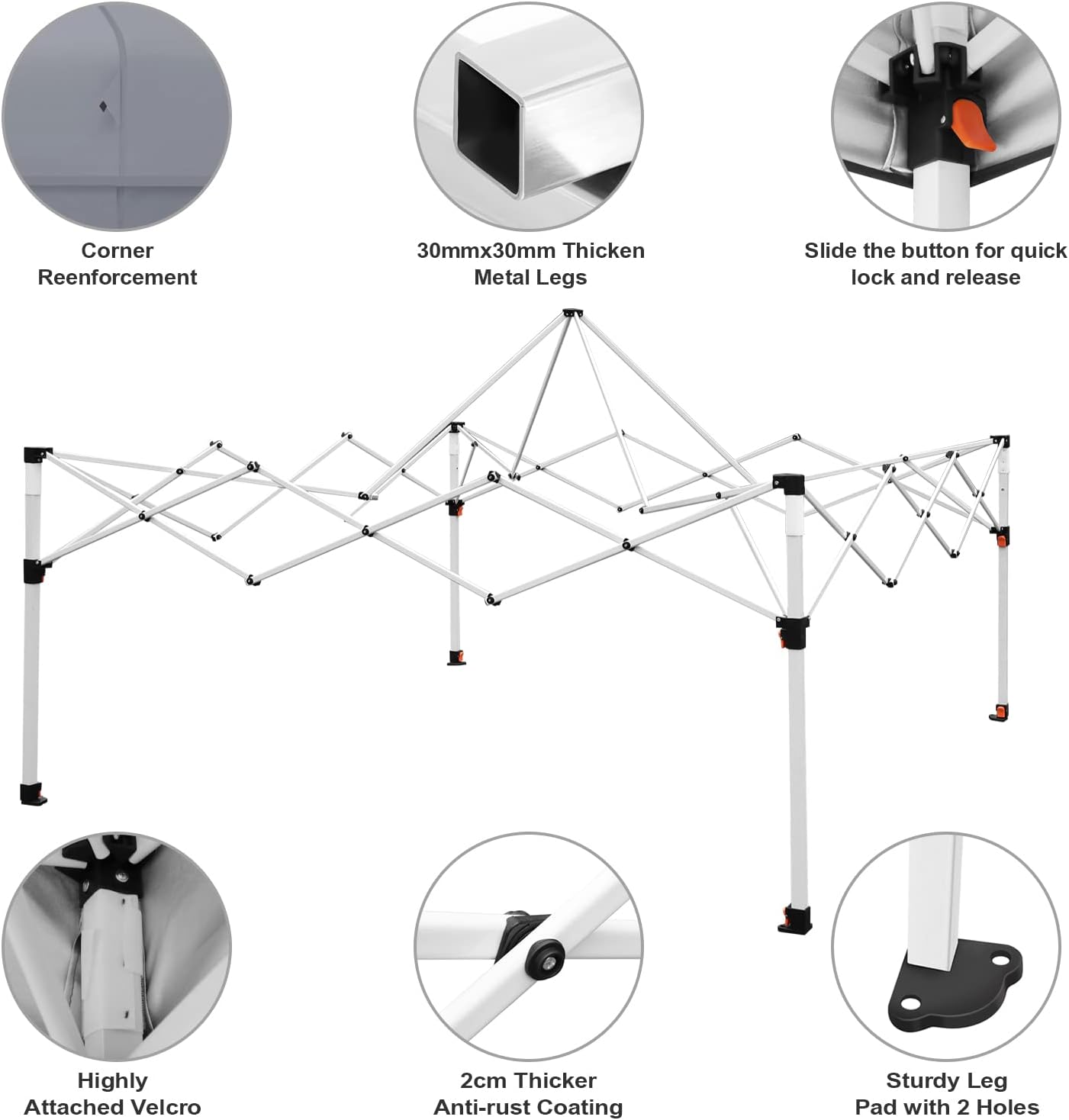 Sturdy Frame: Made of thickened steel pipe 30*30*0.6mm, more stronger and more secure.Sun Protection: 50+UV protection to protect from 99% harmful sun rays.Waterproof: Top cover is silver coated and made with waterproof strip.Easy Transportation: A roller bag is provided, allowing you to easily carry it anywhere and fits with most vehicles.Wide Usage: This pop up gazebo is ideal for camping, party, picnic, park, trade show, party, beach, etc.