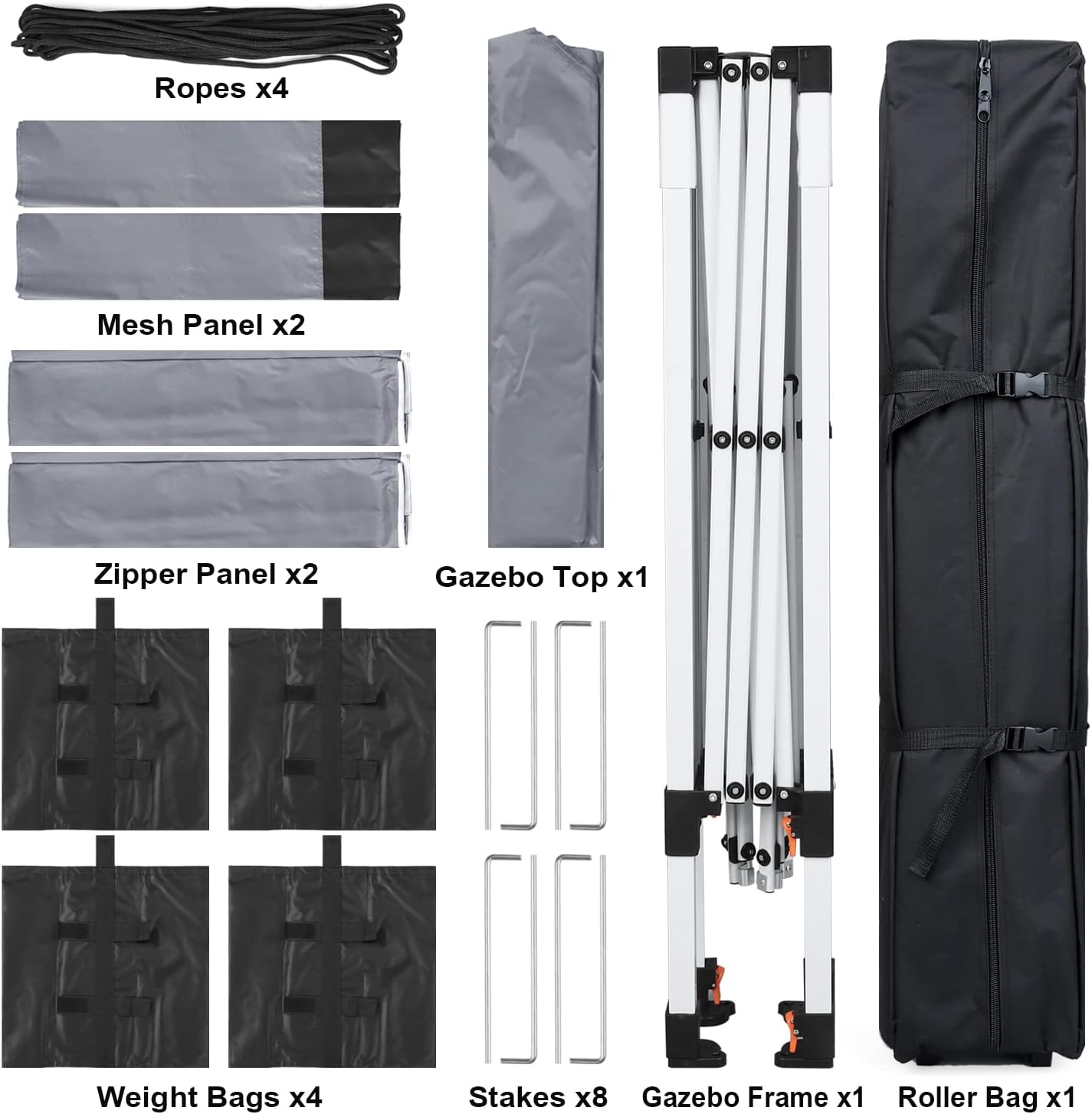 What you get? 1* Gazebo Frame 1* Gazebo Top Cloth 2* Zipper Panel 2* Mesh Panel 4* Sandbags 8* Stakes 4* Ropes 1* Roller Bag
