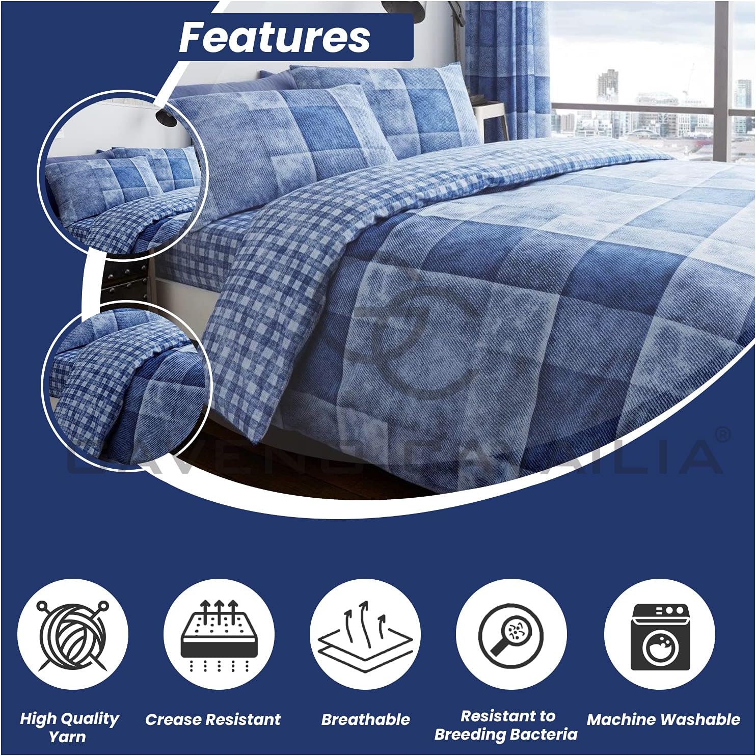 GC GAVENO CAVAILIA Checked Duvet Cover Double (200cm x 200cm) – Quilt Bedding Set Double Bed with 2 Pillow Cases – Blue