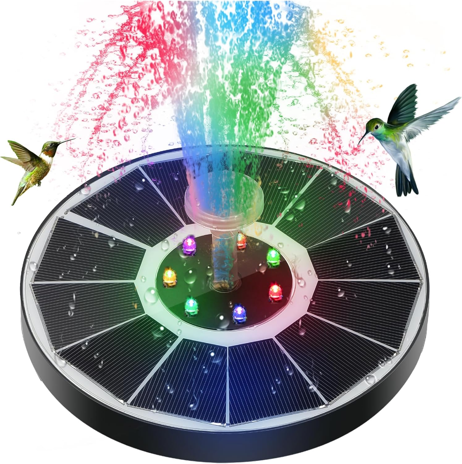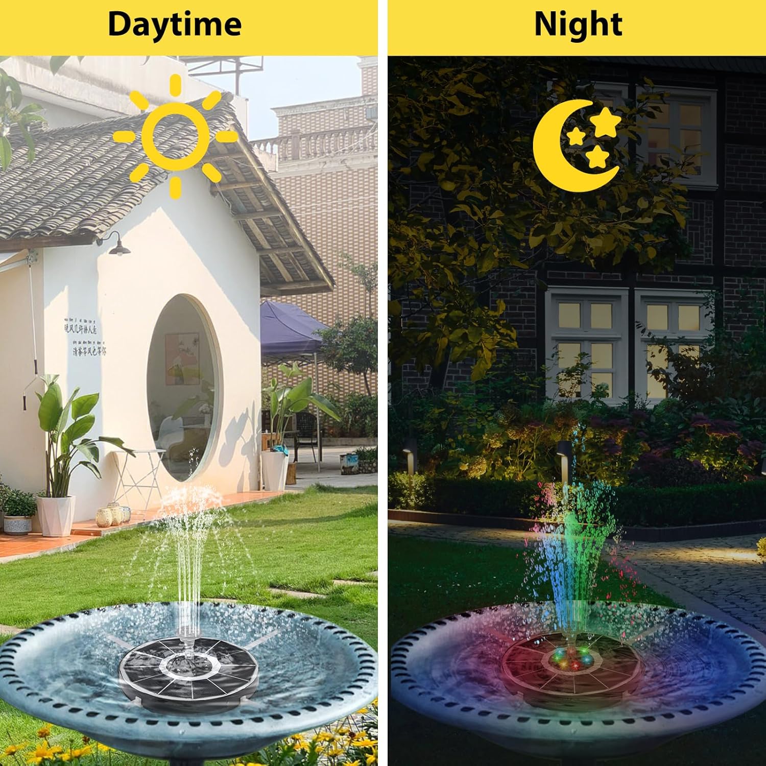 【7 LEDs Solar Water Fountain】: The solar fountain pump comes with a battery, it’s can store electricity under direct sunlight during the day. The stored electricity can make the solar bird bath fountain automatically spray water and light up for up to 3-4h at night. RGB color auto-cycle setting makes your garden look more beautiful at night, it allows you to see the unique light water spray show when you get home from getting off work.