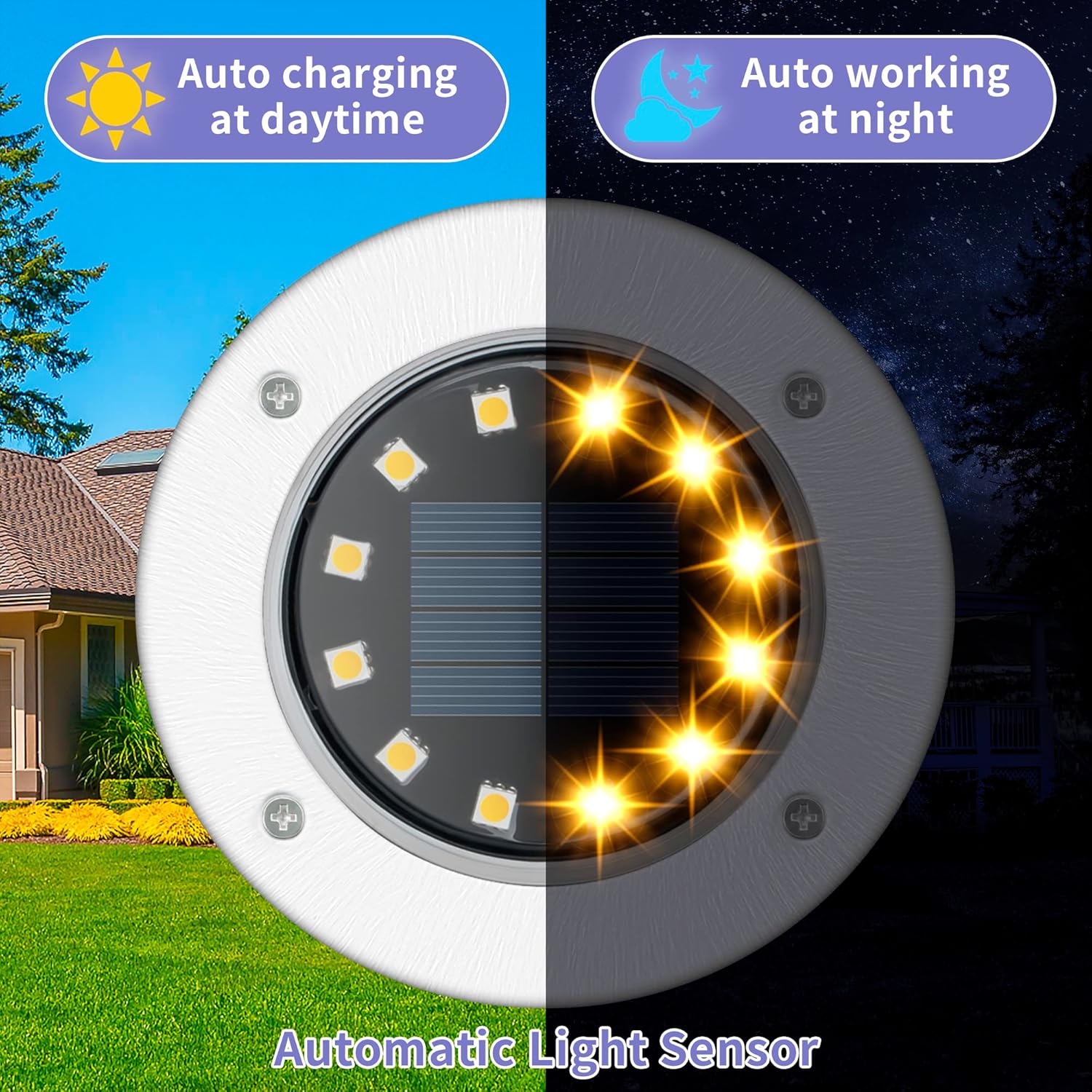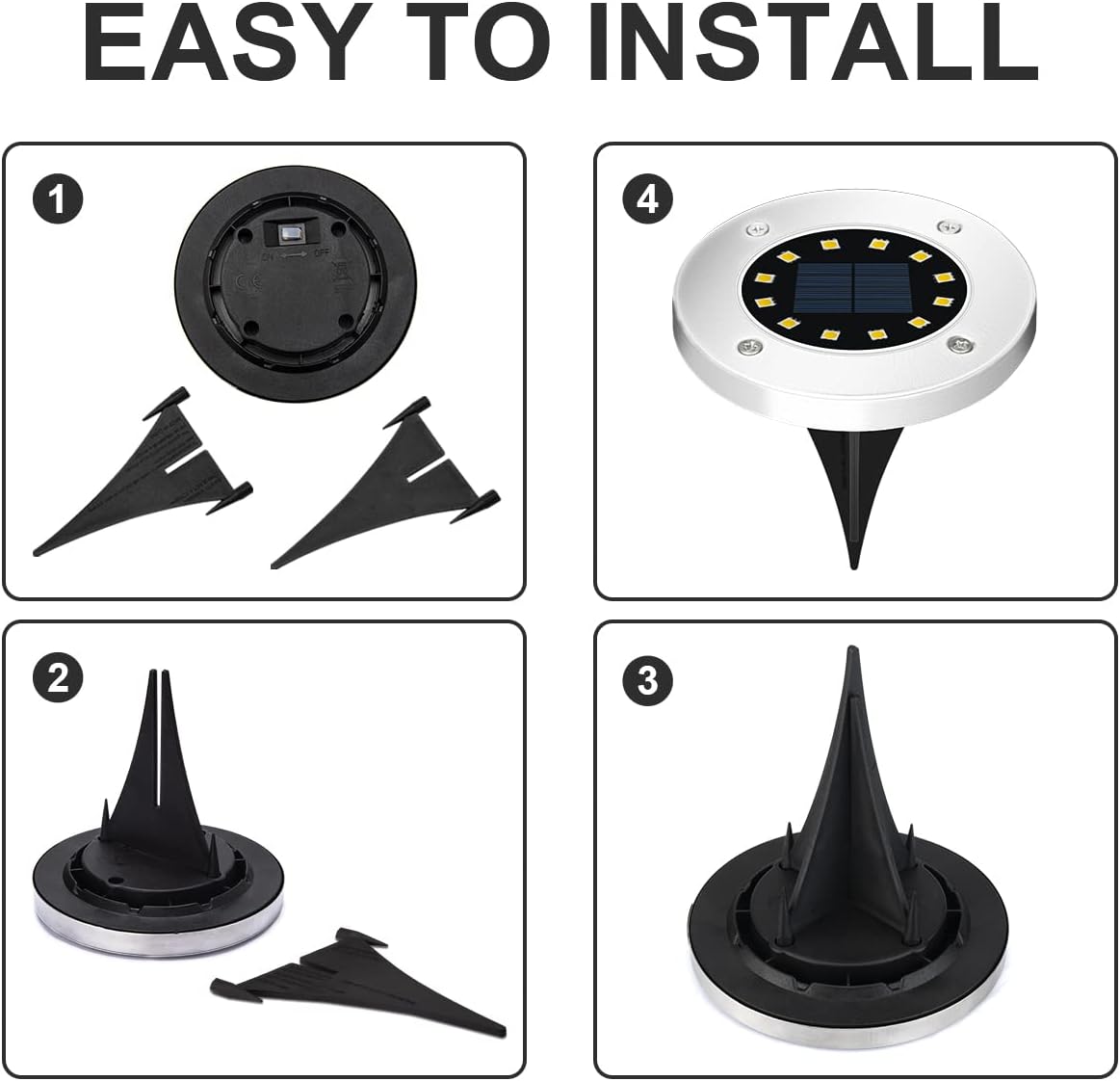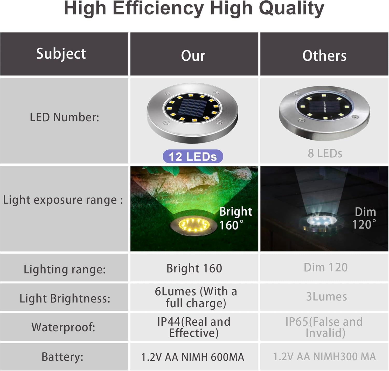 Bright Solar Disk Lights: Compared to other similar lights, our solar light with 12 LEDs has a bigger and brighter illumination range, gives more light for your garden, yard, patio. It can work up to eight hours at night after a full sunny day of charging.