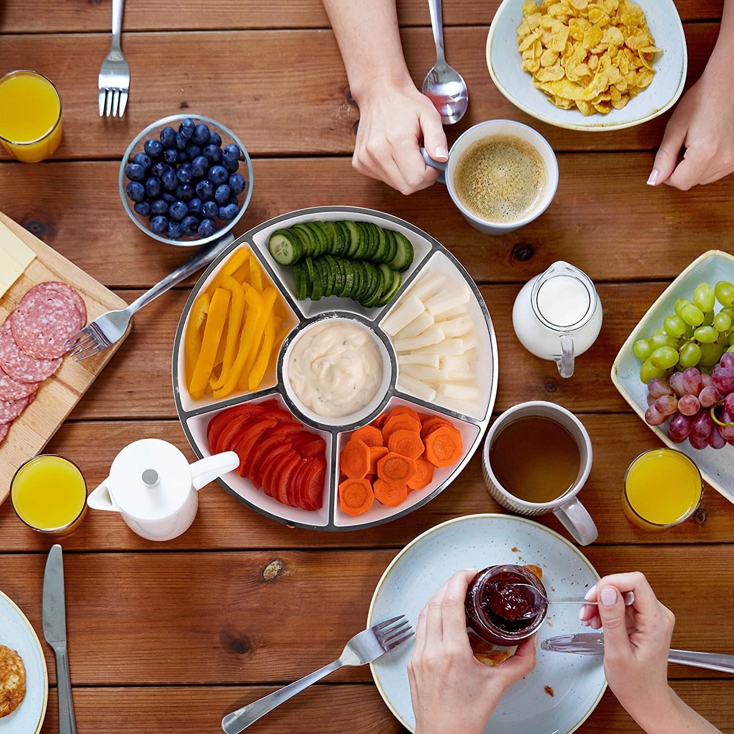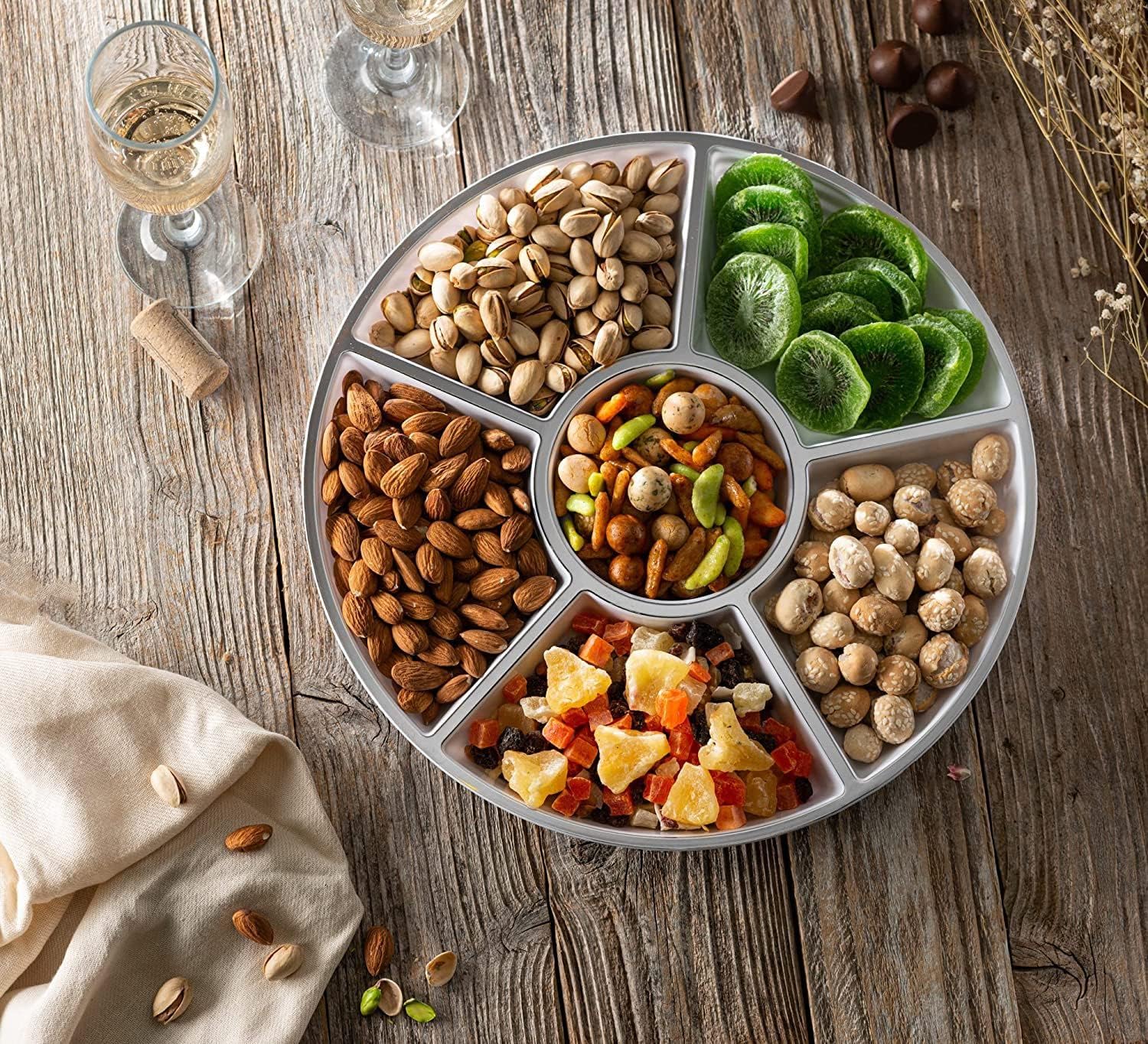 【 6 Separate Compartments】Our 12” round serving platters consists of 6 divided sections with a center dip section which is excellent for serving snacks and appetizers. Its each section are amply sized for chips and salsa, veggies and dip, shrimp and cocktail sauce and much more.