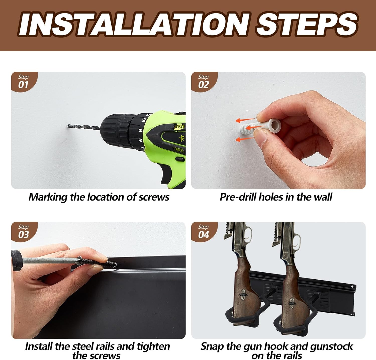 Easy Installation: before installing the gun wall mount, please adjust the space of the barrel and the gun rack for wall to the height you need; Pre drill holes on the wall, install the guide rail and tighten the screws, and clamp the gun hook and butt on the guide rail, so that the gun can be firmly fixed
