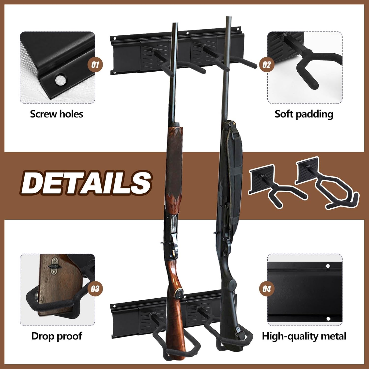 Quality Material: our gun display is made of steel, strong enough to last, it also has rubber wrapped edges as well as soft padding on each hook to protect your gun from scratches and slipping; And please understand that guns in the picture are not included in our package