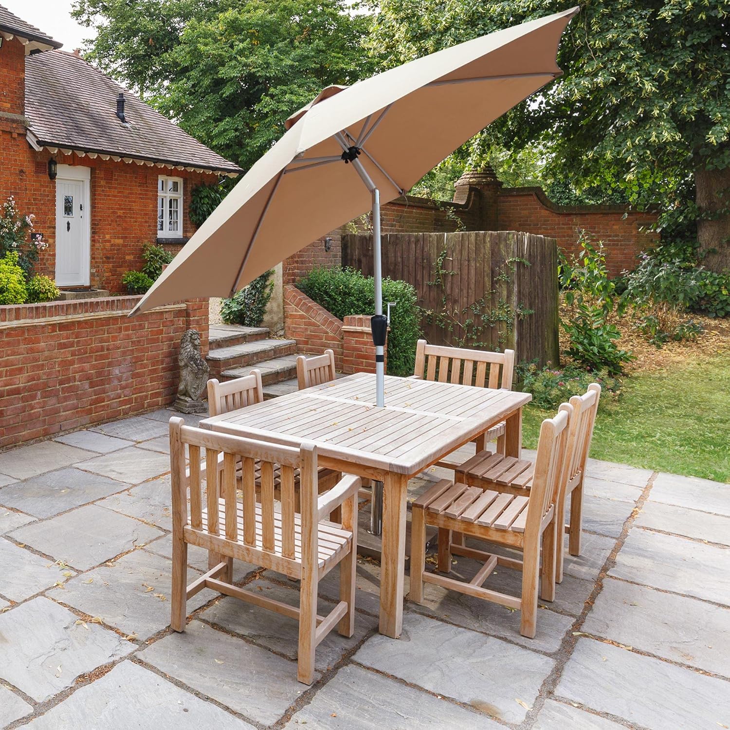 Bring a touch of class to your garden parties and BBQs with this elegant yet practical parasol. Enjoy stress-free sessions on your lawn, patio, or decking – the tilting umbrella lets you get as much or as little sun as you want! Easy to Put Together and Take Apart Unlike a lot of other garden furniture, it’s easy to put together and simple to use. Just click the two pieces together, turn the handle to open the umbrella, and use the push-button to tilt it to the right angle. That’s all there is to it! If your garden party gets rained off, there’s no need to worry! You can just break it down into two compact pieces and store it away almost anywhere. Its stylish design is as tough as it is practical. It’s made from lightweight yet durable aluminium and has a tough fabric canopy that’s resistant to tearing – perfect for households with children and pets! It’s simple, affordable, and effective, while also being stylish enough to fit into almost any garden. We can’t promise the sun will always be shining, but when it is, this premium parasol is the best way to relax in it! Height 2.35 meters Diameter open 2.7m Pole Diameter 38mm Cover Included UV40+ Protection Yes Material Aluminium Waterproof Yes Parasol Struts 6 Parasol Material 190g Polyester Date First Available : 10 Jun. 2022 Customers like the quality, ease of use, color, shade and size of the umbrella. They mention that it’s well made, easy to set up and looks lovely in the garden. They appreciate the shade it provides and the size it covers. AI-generated from the text of customer reviews