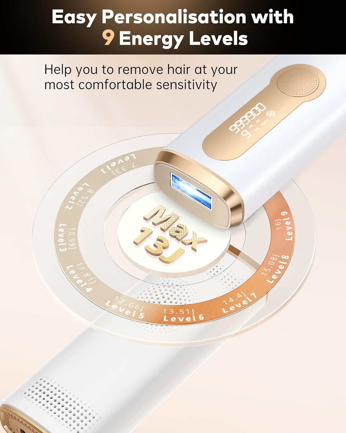 【9 Levels for Precision Hair Removal】This painless facial hair remover for women has 9 energy levels (up to 16J) that allow you to remove hair at the most comfortable sensitivity. Auto and manual modes also help you precisely remove unwanted hair on arms, legs, underarms, bikini area, upper lip, back and chest.