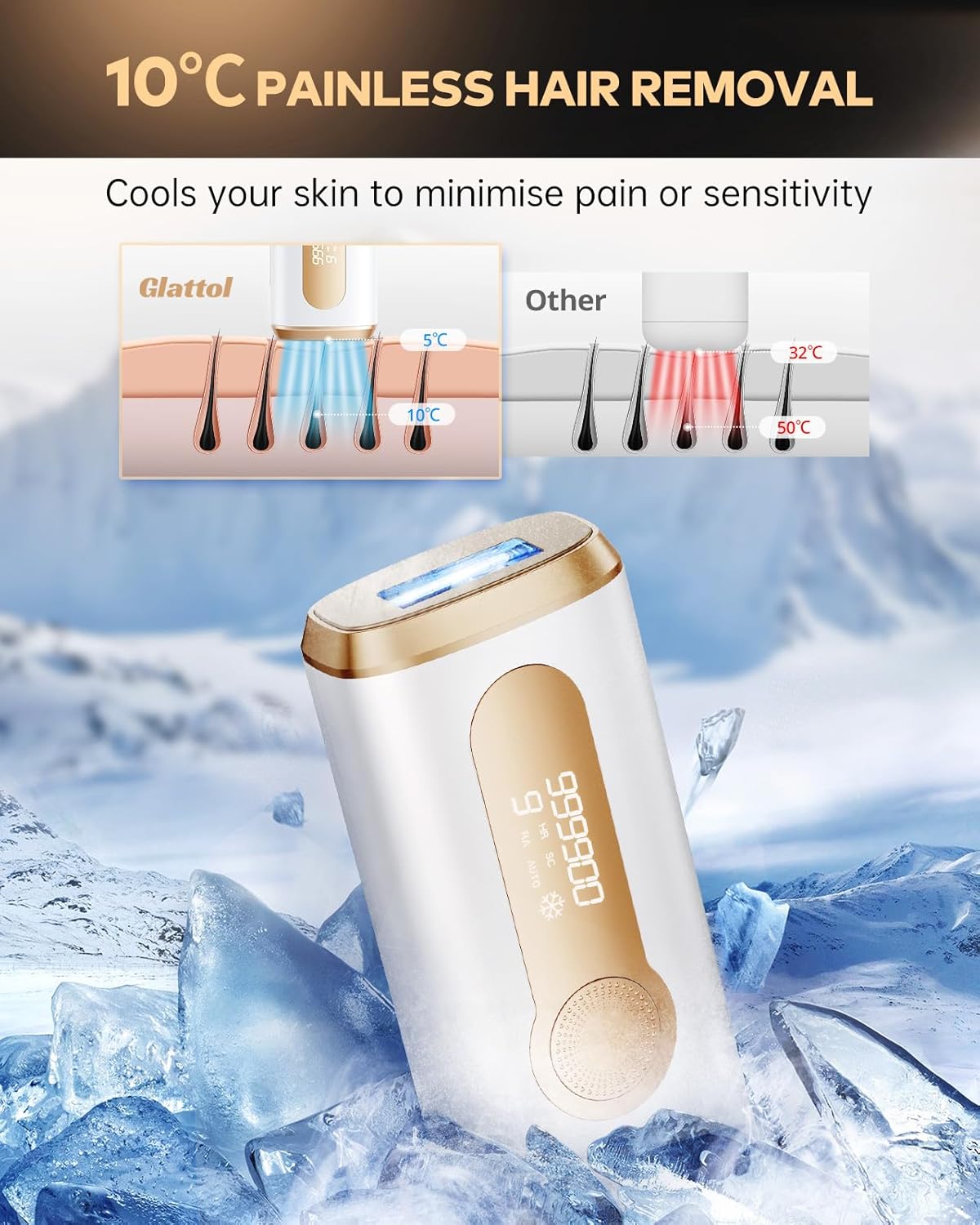 Glattol IPL Laser Hair Removal – Painless & 3-in-1 & Full Body Smooth, Ice Cooling Hair Removal Device with 9 Levels (Max 16J) and 2 Modes, At-Home Hair Removal for Women and Men, Gold
