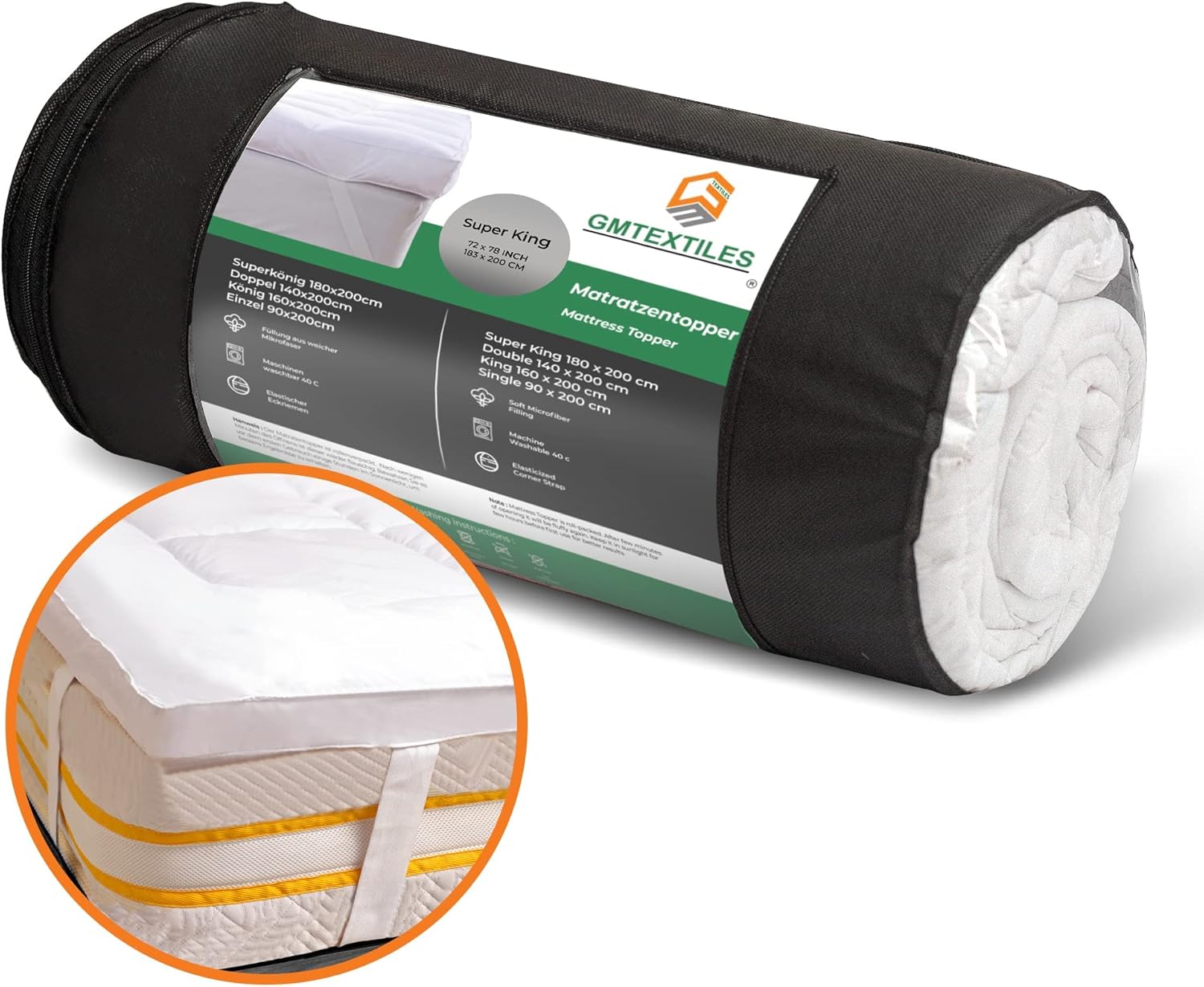 GM textiles mattress topper single are100% pure polyester microfiber 230 thread count with a 5 cm deep side gusset. Baffle box of these hotel quality mattress topper single bed stitched to keep the filling equally spread into square pockets.