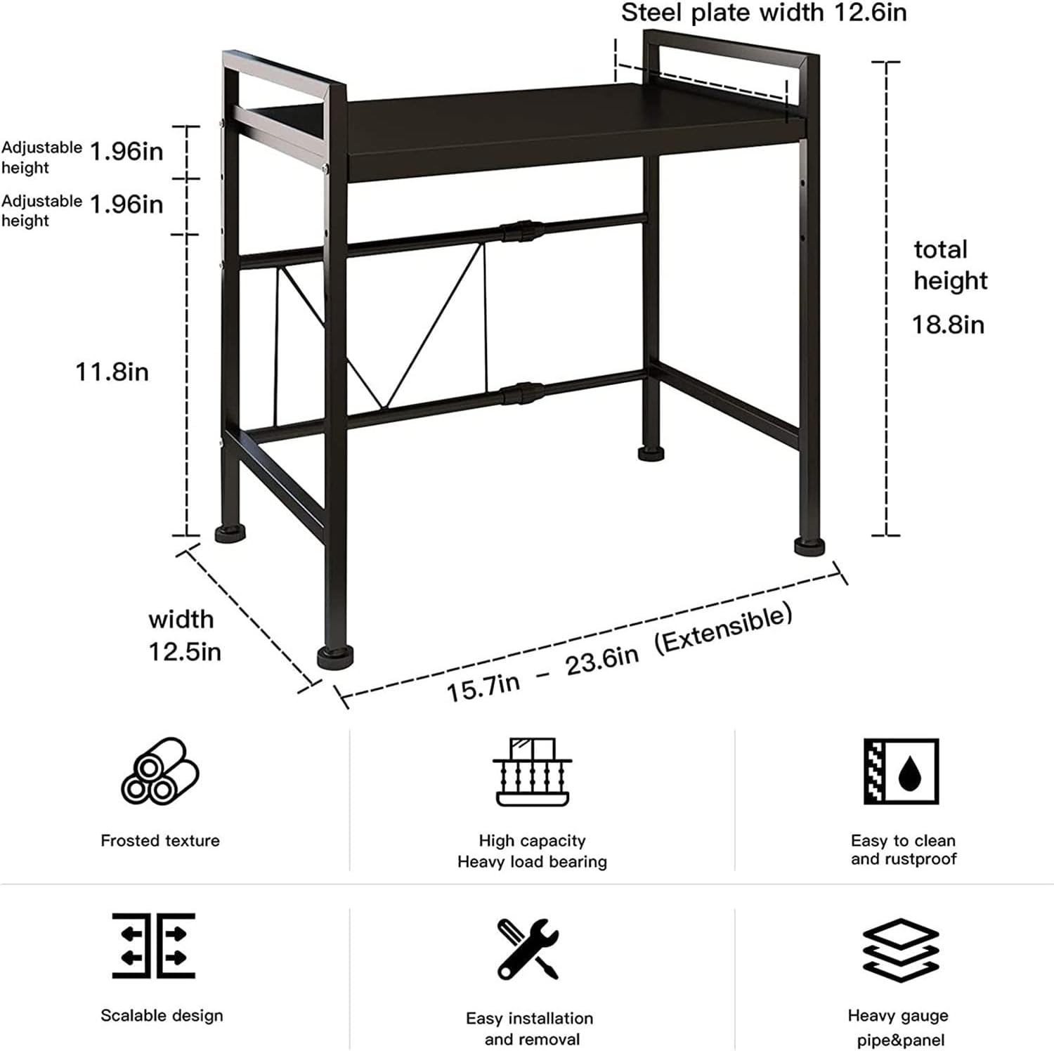 GOI Microwave Shelf Stand, Expandable Microwave Oven Rack Storage Solution Organiser Stand Utensil Holder Adjustable Width & Height Kitchen Stand Counter Shelf with 3 Hooks (Black 1-Tier)