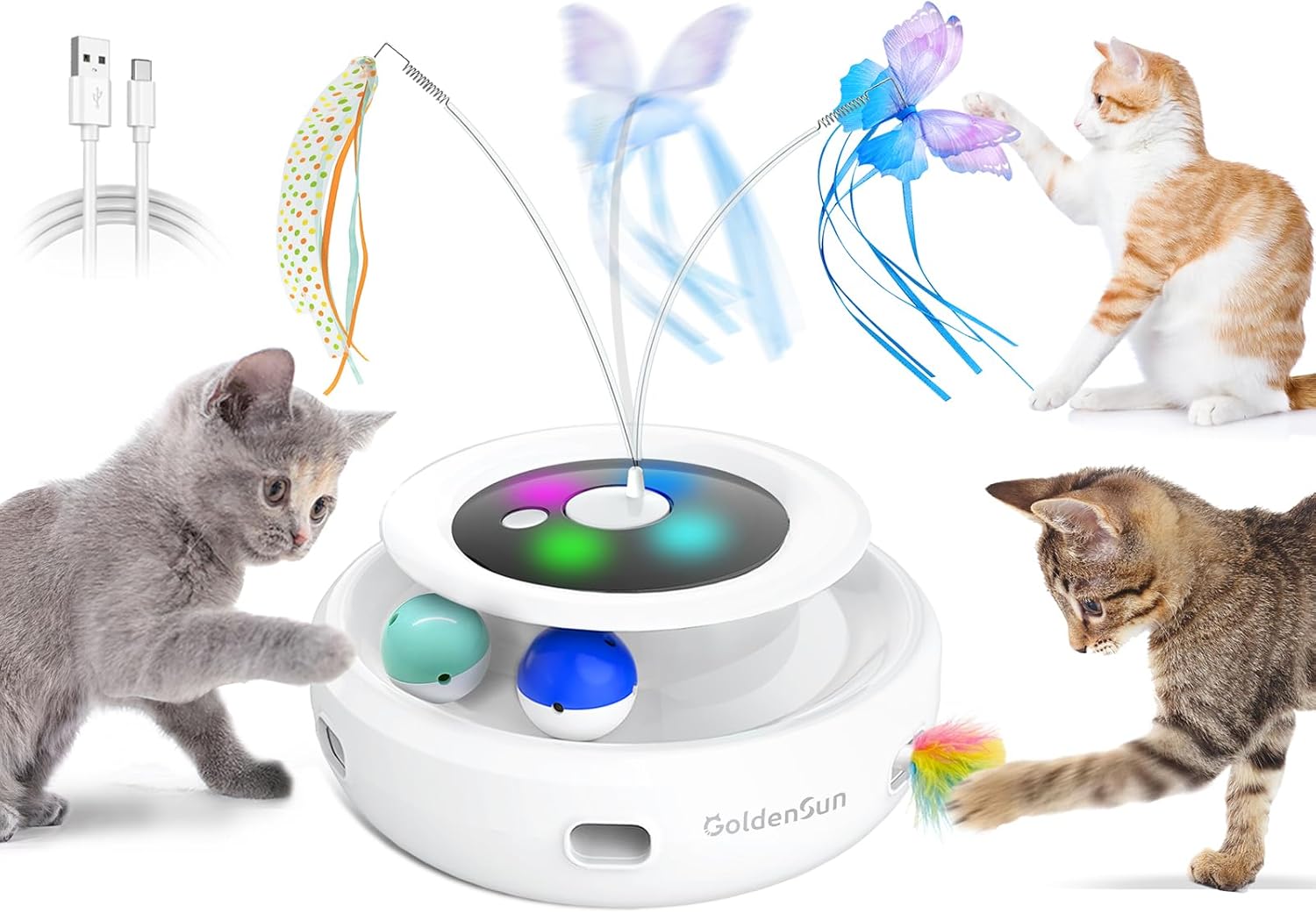 🎁[3-in-1 for more fun ] GoldenSun interactive cat toys seek to engage cats’ natural instincts: chasing, pouncing, ambushing. Spinning balls stimulates your cat’s senses. Random popping feather stimulates hunting instincts. And rotating butterfly encourages to chase. All of these entertain your cats and burn their energy!