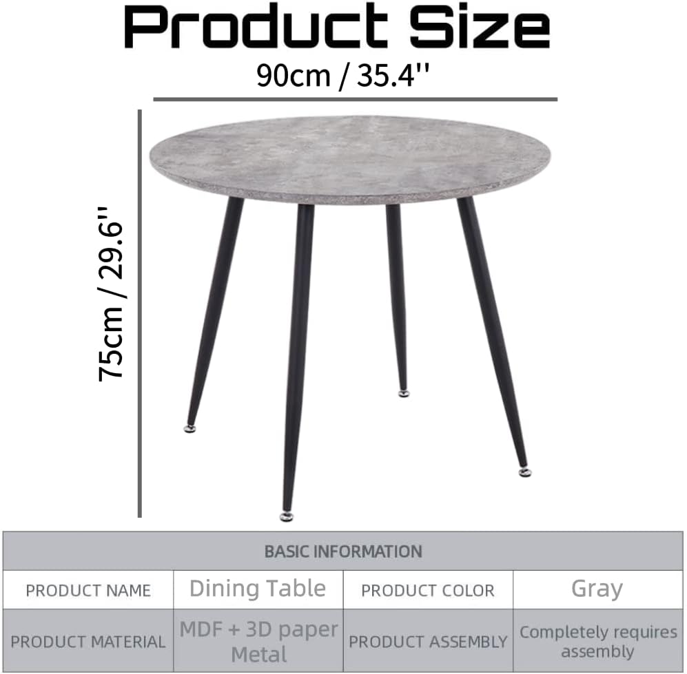 Size: 90 × 90 × 75 cmWeight: 18 kgColor: GreyMaterial: MDF + Marble 3D Sticker + MetalStyle: ModernForm: Round (we also have rectangular dining tables)Package: 1 Parcel