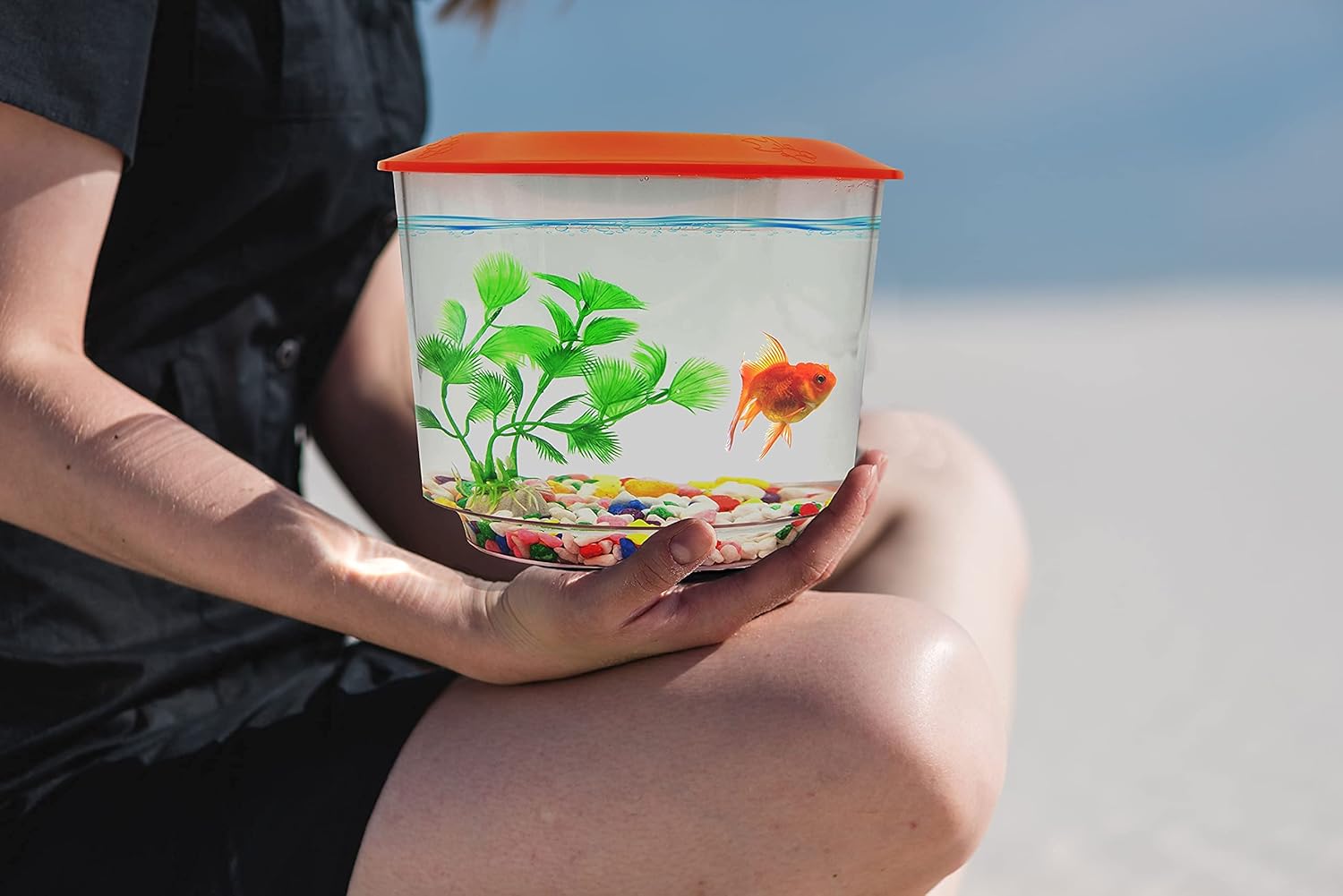 【PACKAGE INCLUDES】With this Gold Fish Tanks set, you get 1 Goldfish Bowl, 1 Random Colour Lid (Blue or Orange), 1 Pack of Assorted Multicoloured Gravel & 1 Ornamental Plant. All you need for starter kit. You need NO BATTERY, NO ADAPTER for this bowl.