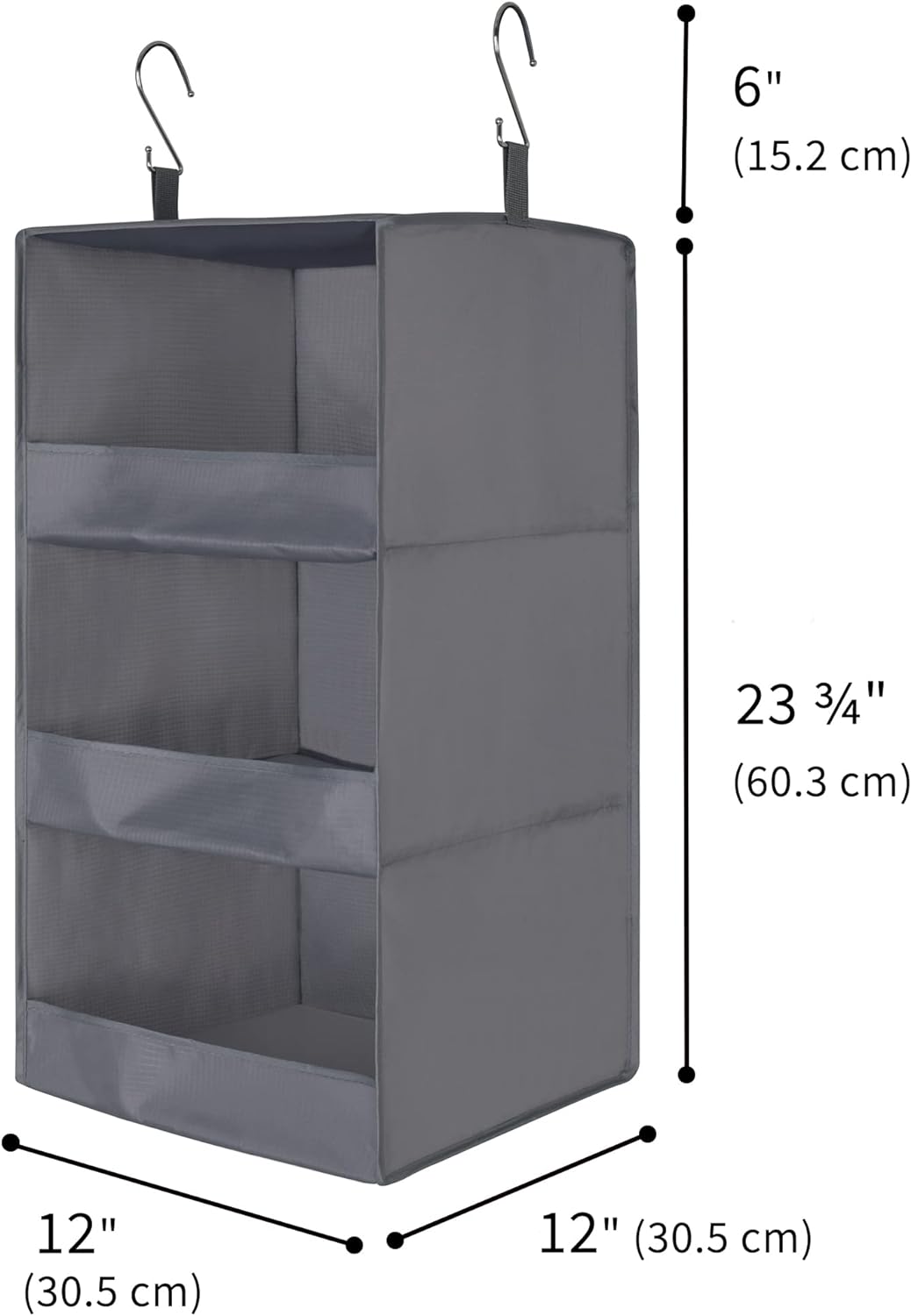 Ample Space – Including the hooks, the grey hanging organiser measures 30.5 x 30.5 x 75.5 cm (LxWxH). Additionally, each shelf is 30.5 x 30.5 x 19.5 cm (LxWxH).