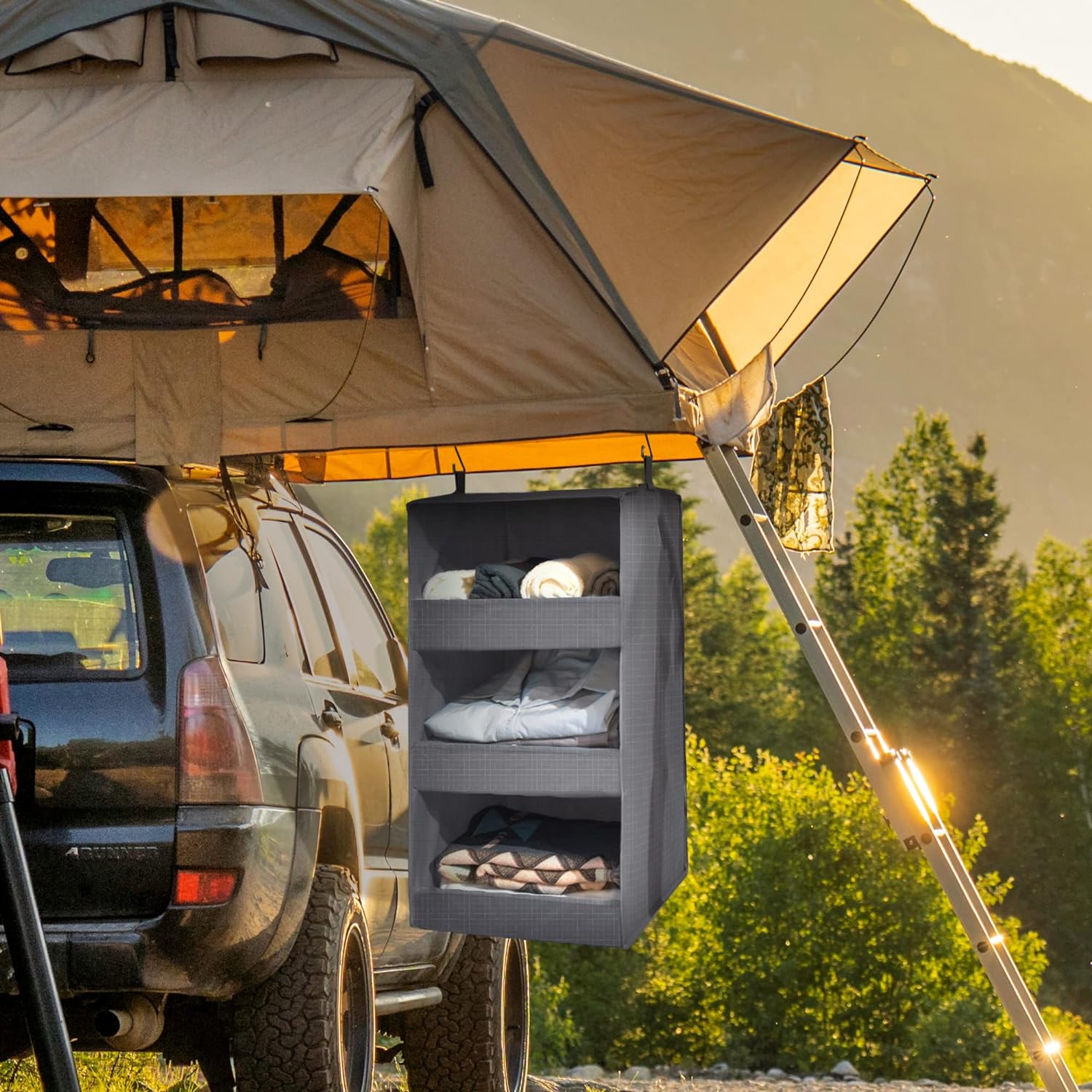 The hanging storage organiser is foldable and convenient for traveling use.