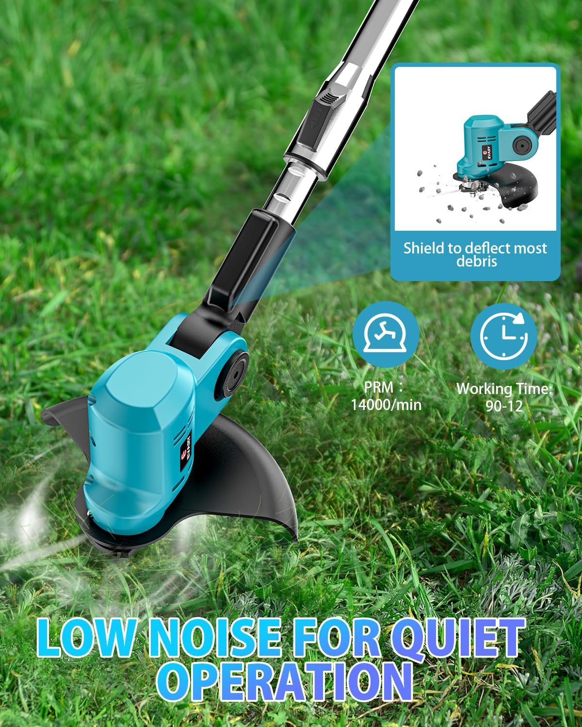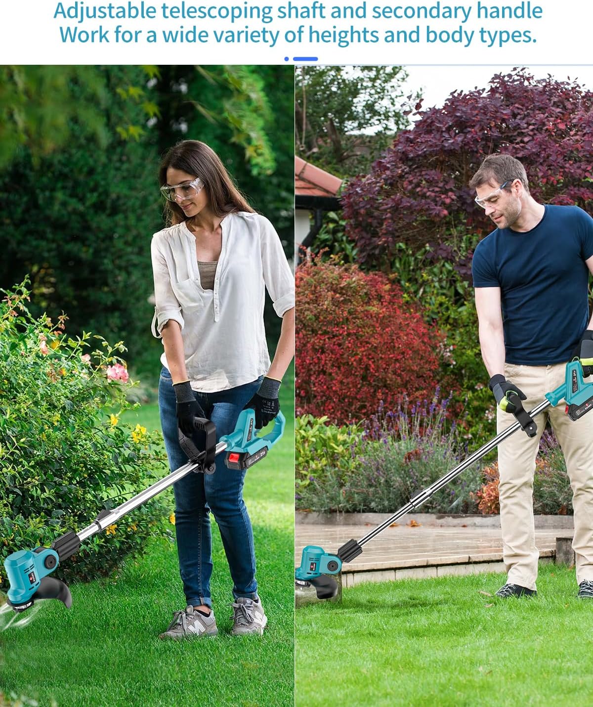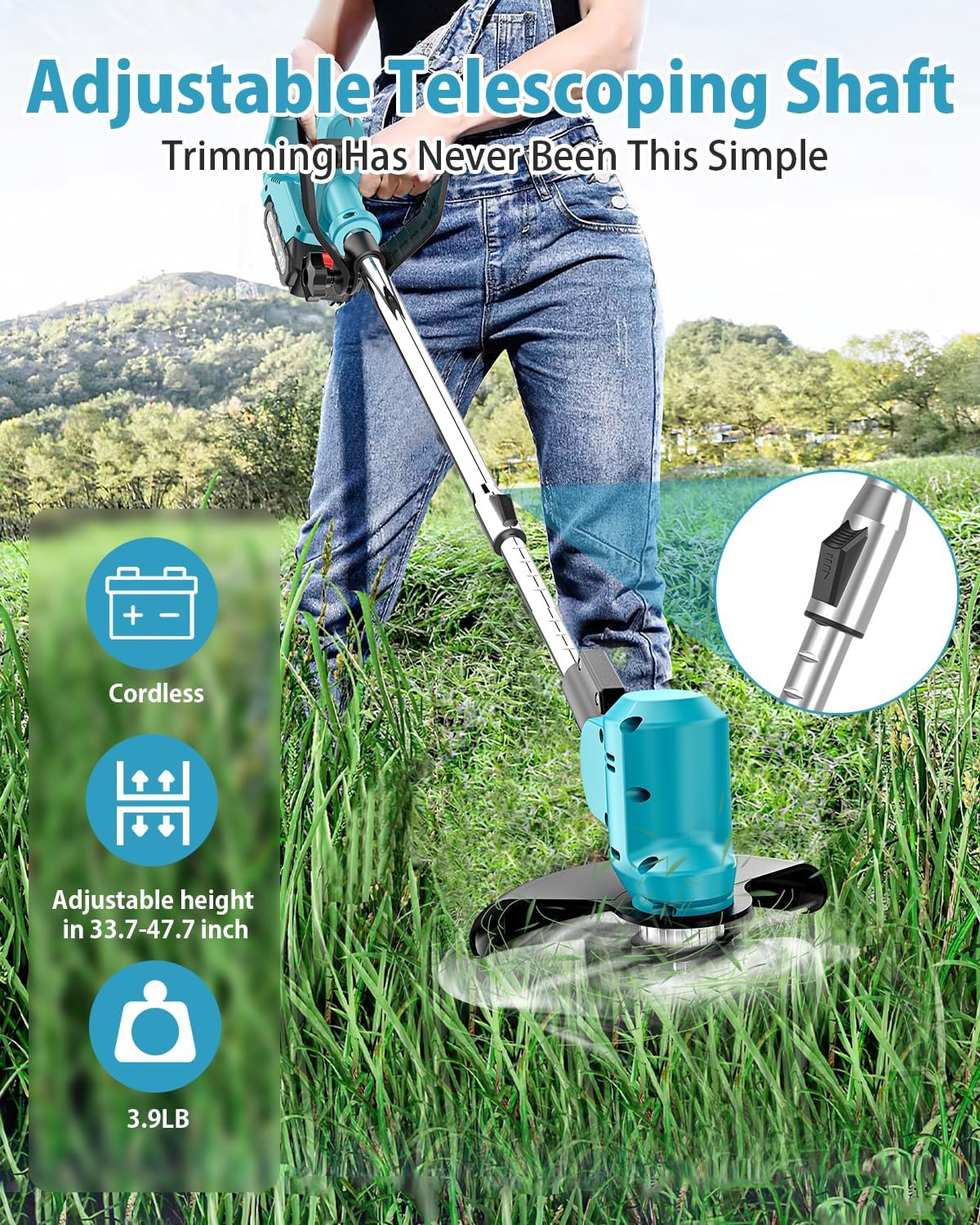 Trimming Has Never Been This Simple – Cordless Brush Cutter with an easily adjustable telescoping shaft in 33.7-47.7 inch long, that make it comfortable for people with various body types. Adjustable height and handle with premium soft grip improves comfort and control, without bending over to trim the back of the bushes. The Battery Powered Weed Eater can easily break through tall grass and weeds and send debris flying while they cut, they have a shield to deflect most debris.