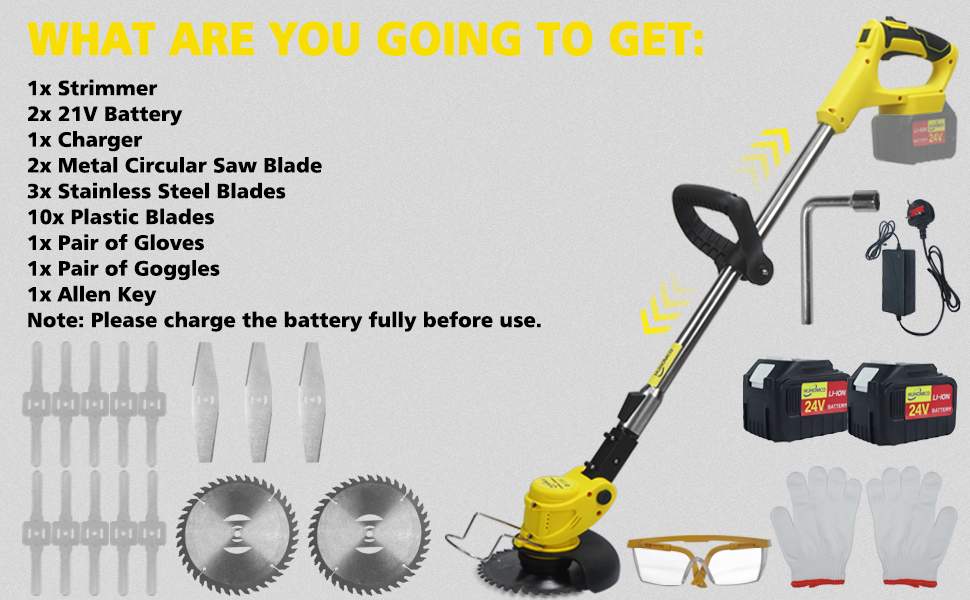 Material: ABS, MetalBattery: 24VPower: 500WCutting Diameter:14cmSpeed: 8300 RPMPlug: UKContraction Length: 90cmStretch Length: 120cmBattery Type: 2 x 2000mAh Lithium-Ion BatteryCharging Time: 1-2 Hours/per batteryUsage Time: 40 – 60 minute