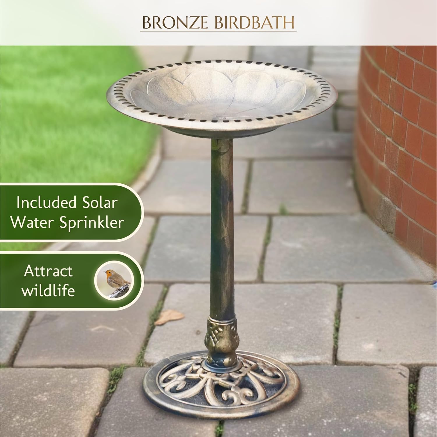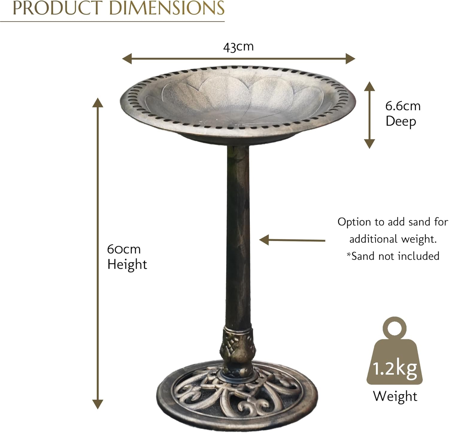 Welcome birds to your garden with the GreenGrove Deluxe Garden Pedestal Bird Bath. Available in green or bronze. Combining Victorian elegance with modern durability, this bird bath is crafted from weather-resistant resin to withstand all weather conditions. Available in Green and Bronze finishes, it adds a touch of sophistication to any garden. Measuring 60cm in height with a 43cm diameter bowl, it provides a spacious area for birds to drink, bathe, and relax. The intricate Victorian-style design features a decorative mottled pattern and an ornate base, creating a beautiful and safe spot for birds. Assembly is tool-free and straightforward—simply screw the parts together. Customers rave about the easy assembly and sturdy construction. For added stability, the bird bath includes U-shaped ground pegs for lawns and a hollow pedestal that can be filled with sand or pebbles for solid surfaces. Despite its lightweight design for easy relocation, it becomes extremely sturdy when properly anchored or weighted, ensuring stability even in windy conditions. Perfect for bird watching, the GreenGrove bird bath enhances your garden’s beauty and creates a welcoming environment for various bird species.