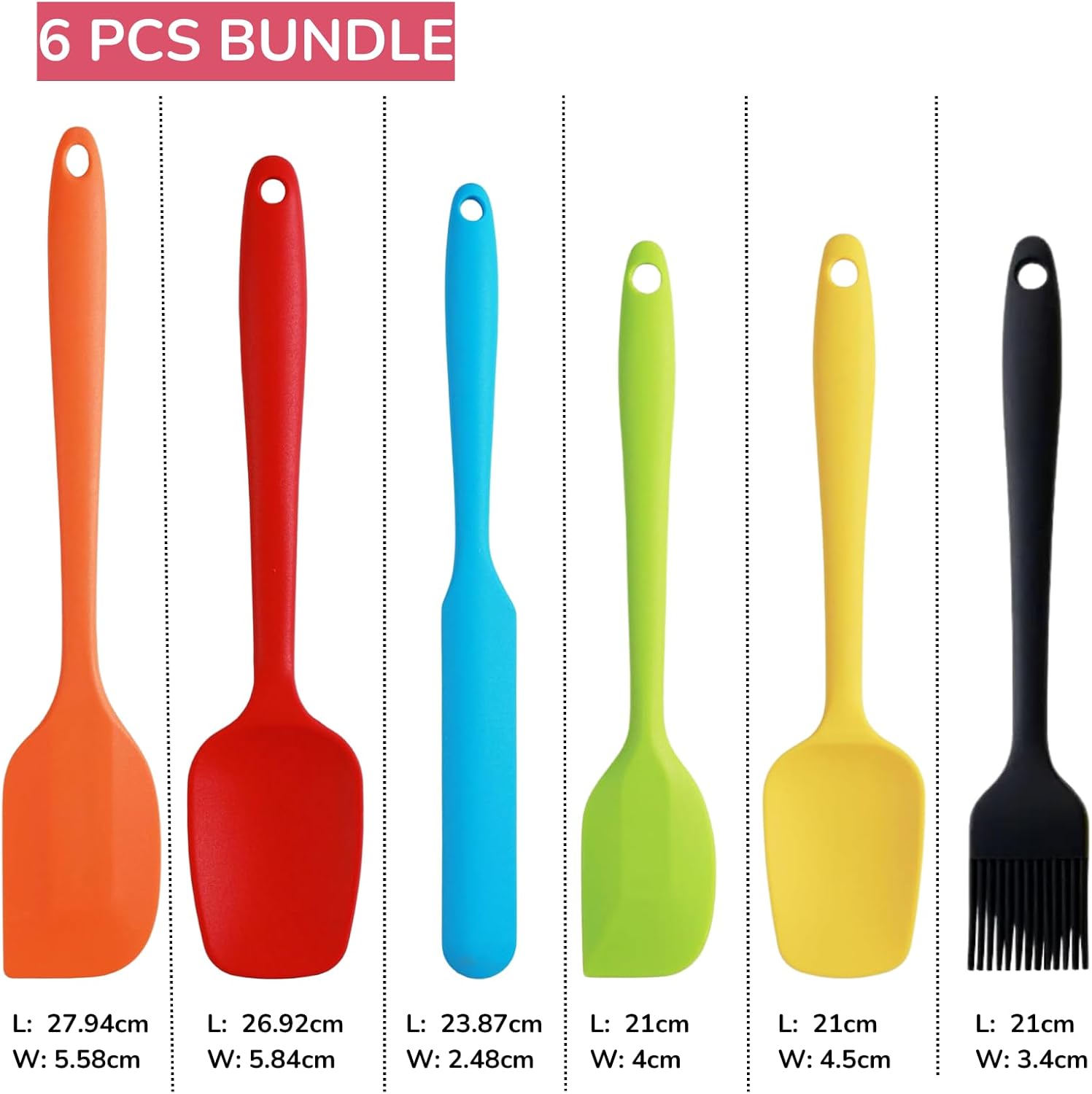 🍳 Multiple Sizes: Our non-stick silicone spatula set includes various sizes to meet your cooking needs: 1 large spatula, 1 large spatula spoon, 1 spatula knife, 1 small spatula, 1 small spatula spoon, and 1 oil brush.