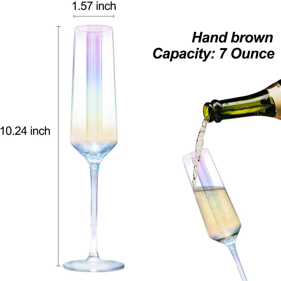 TRANSPARENT RAINBOW CUP BODY: Customized with ion-plated rainbow glass is low-key and luxurious,which is a symbol of romantic wedding taste. The body of the champagne flutes glasses set of 2 is crystal clear and shiny. If you hold our champagne flutes in the sun, it is simply a rainbow in your hand!