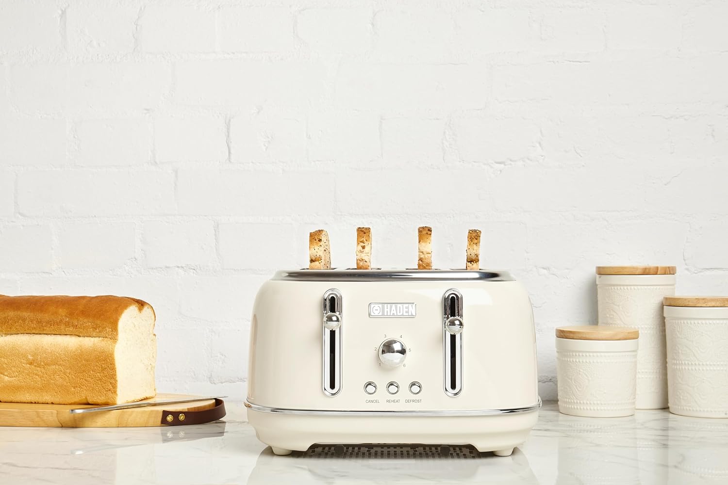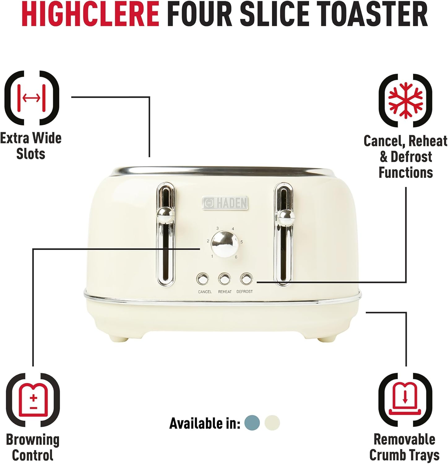 Haden Highclere Cream Toaster 4 Slice – Electric Stainless steel Toaster With Reheat And Defrost Functions – Easy To Clean – Removable Crumb Trays
