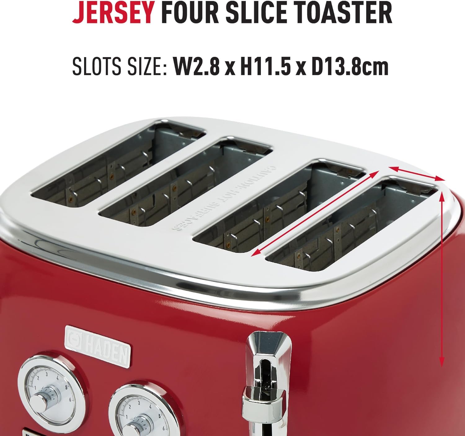 Haden Jersey Red Toaster 4 Slice – Retro Stainless Steel Design with Reheat, Defrost, Self-Centering Functions, Customizable Browning Control – 1370-1630W, 220-240V – Elegant Kitchen Appliance