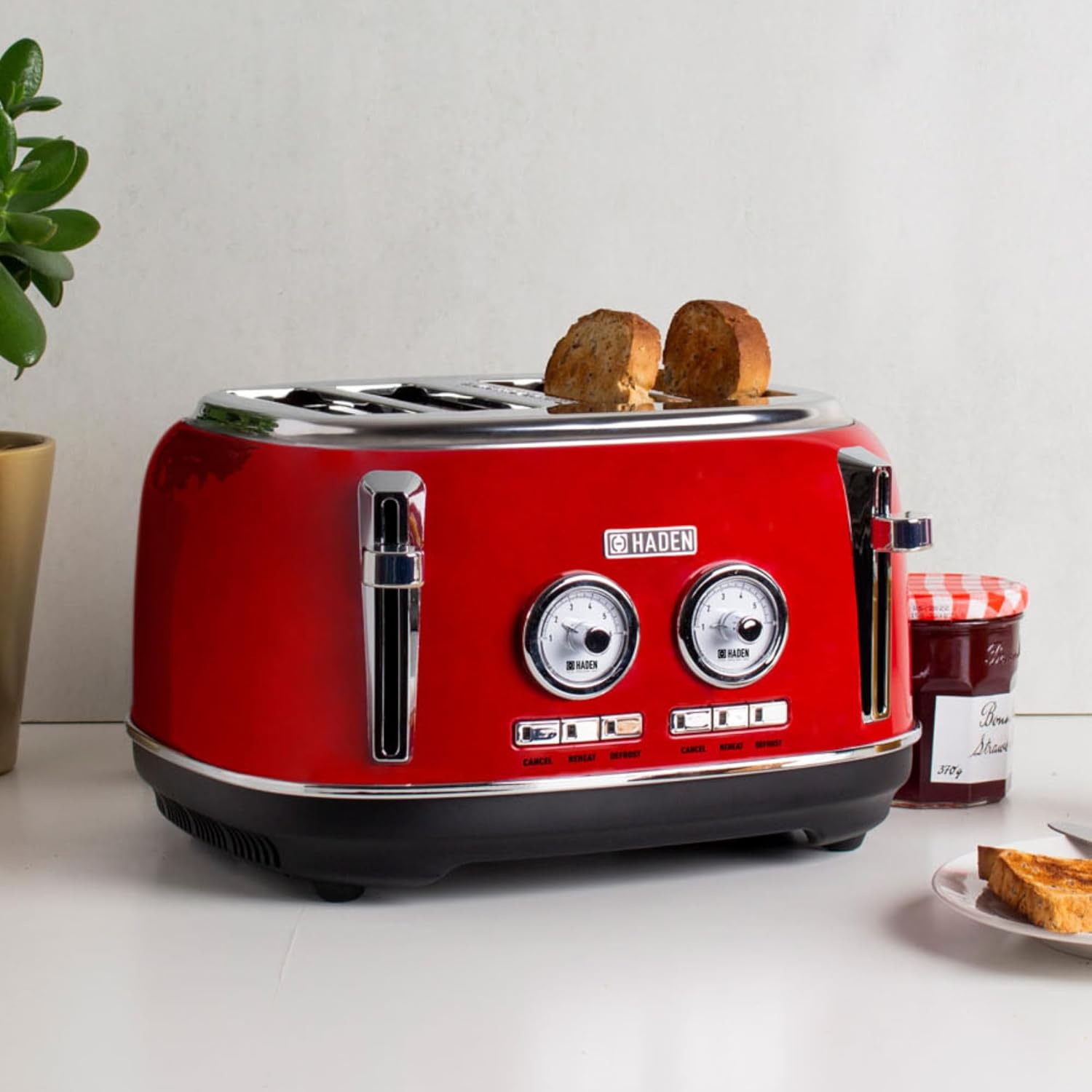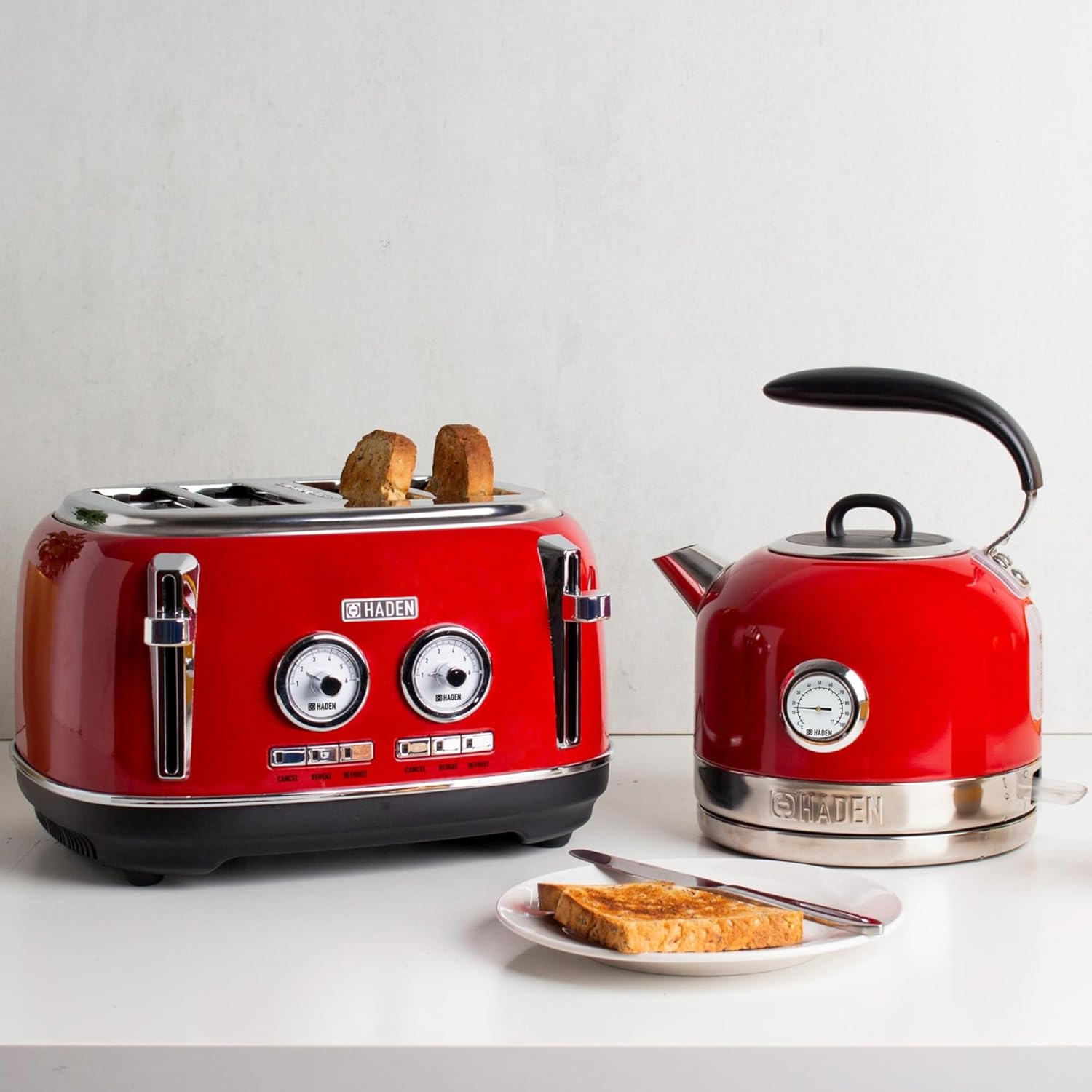 Retro Style, Modern Function: The Haden toasters and kettles sets blend a vintage aesthetic with modern functionality, featuring a red toaster 4 slice wide slot that’s as efficient as it is visually appeaaling.