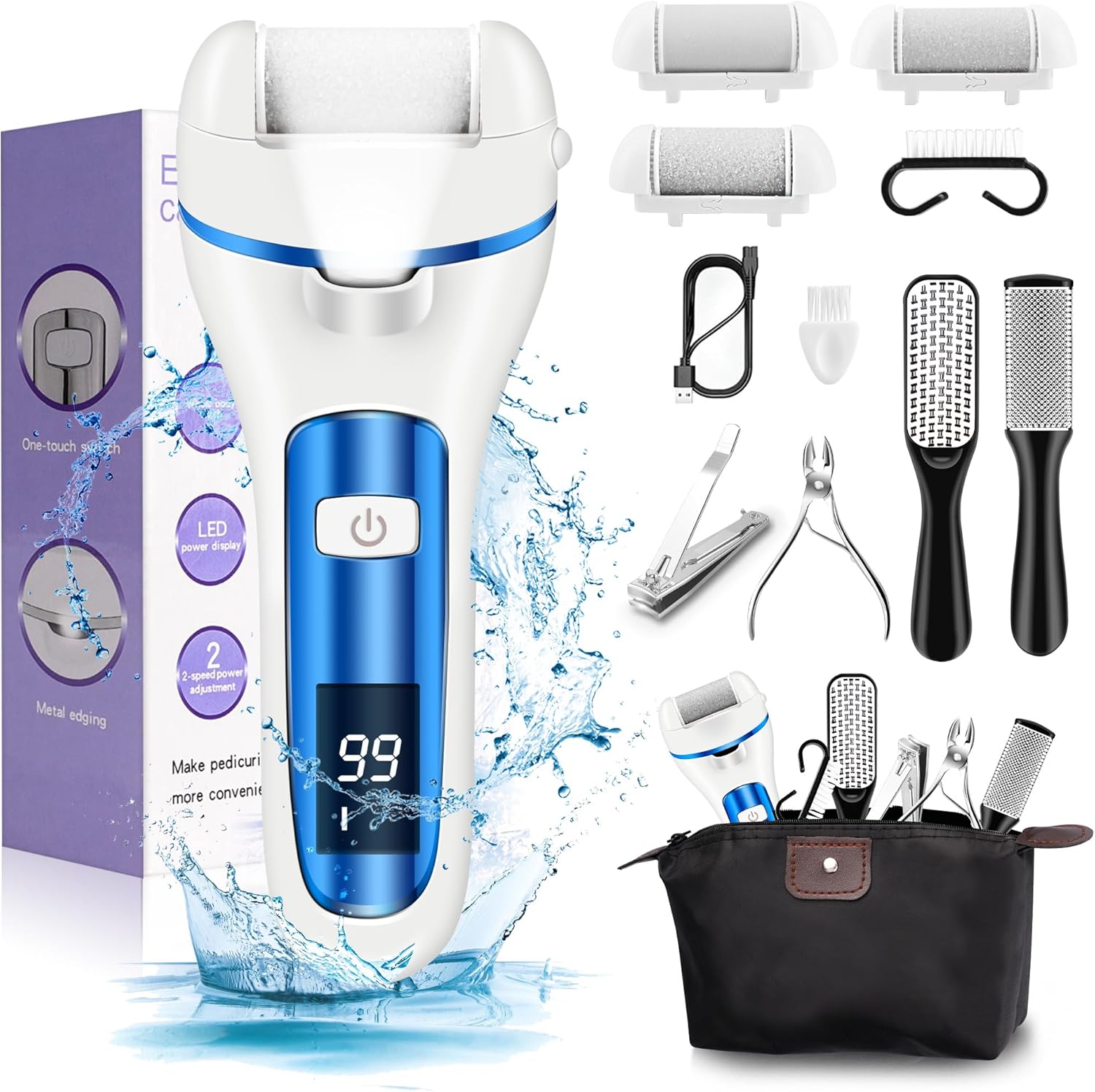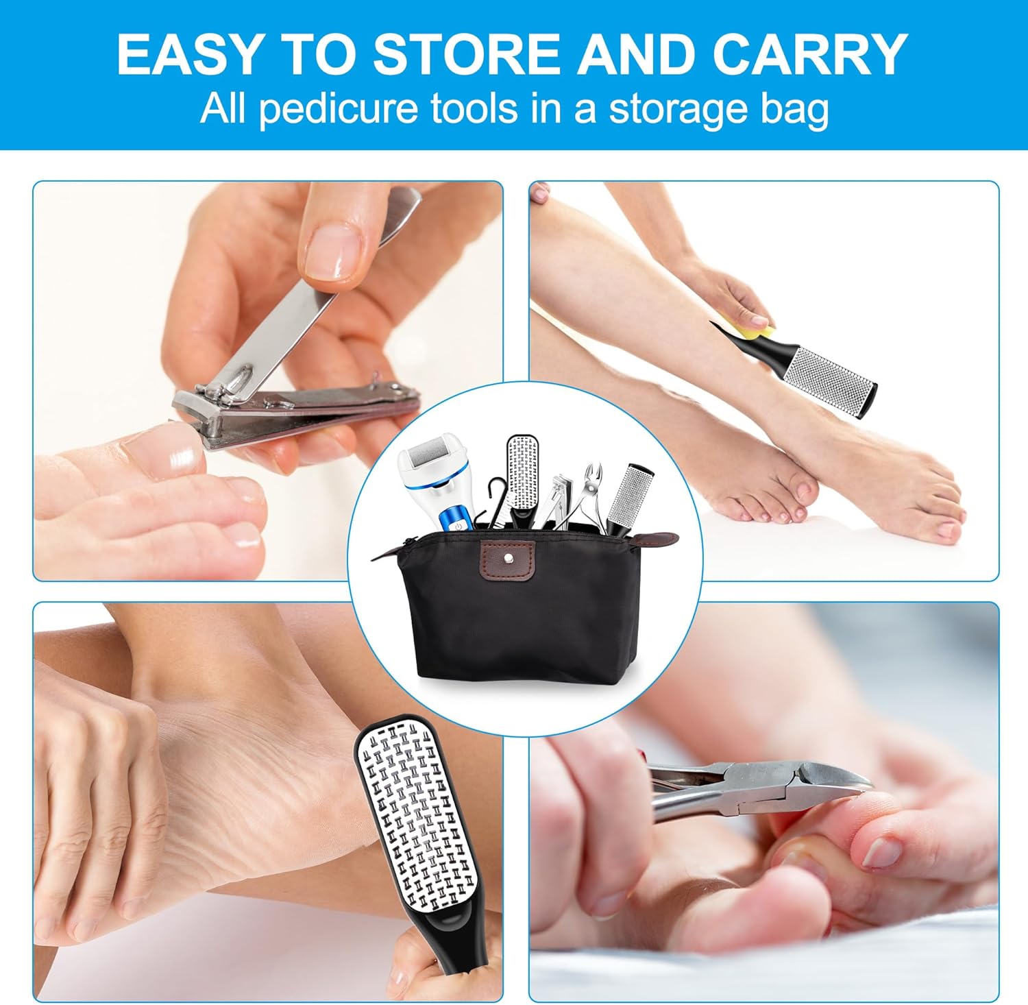【Easy Store & Carry】 Foot dead skin remover pedicure kit, including rechargeable callus remover, 3 different quartz sand grinding heads and exfoliation,foot scraper, cuticle pusher, foot clipper, callus remover, cuticle remover, foot file, nail file, nail toenail clipper, etc. One-stop pedicure, no need to purchase other accessories, a full set of tools that can meet your different needs.The black storage bag can help you organize all your tools easily and quickly.