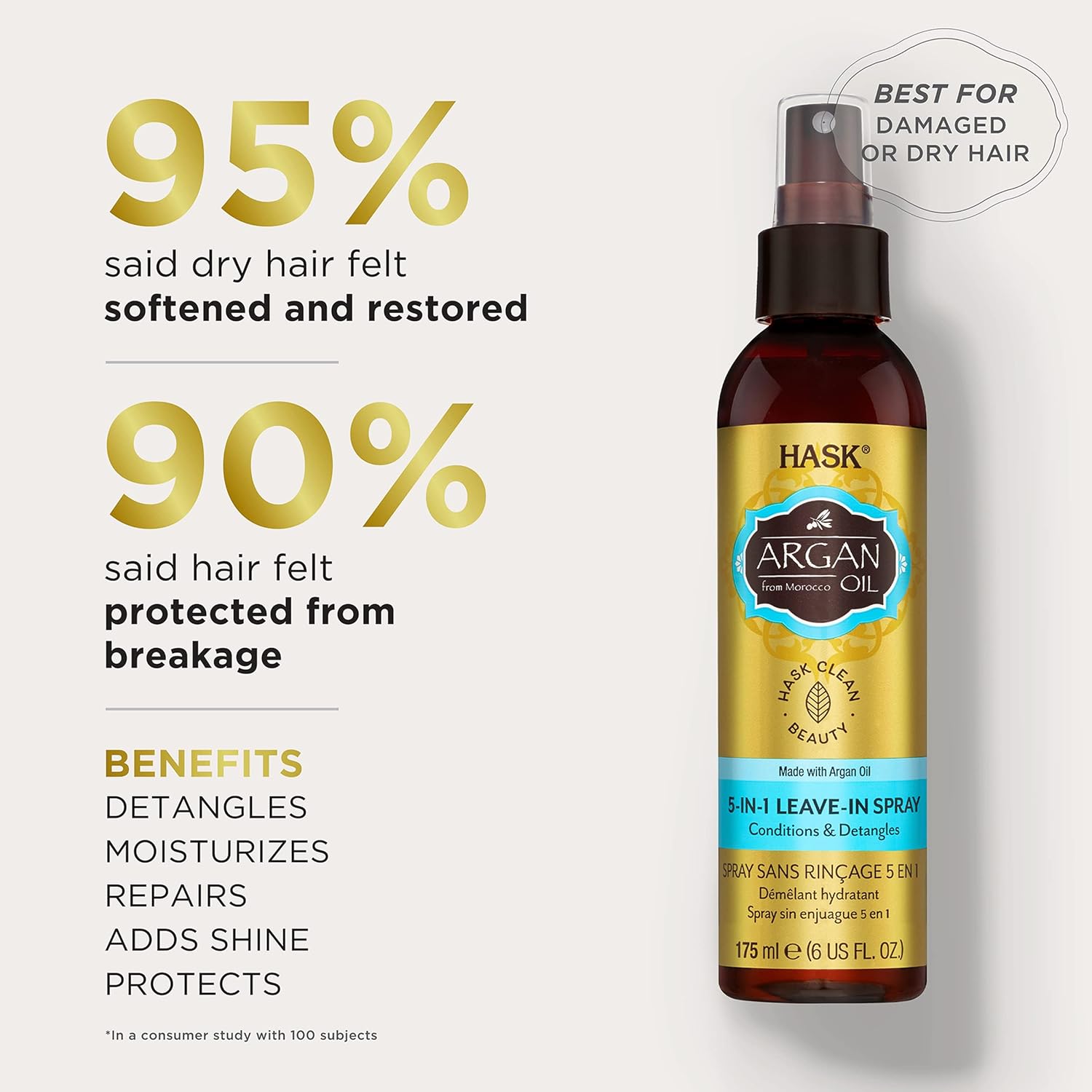 HASK Argan Oil 5-in-1 Leave In Conditioner Spray, repairing for all hair types, colour safe, gluten free, sulfate free, paraben free – 1 175ml Bottle
