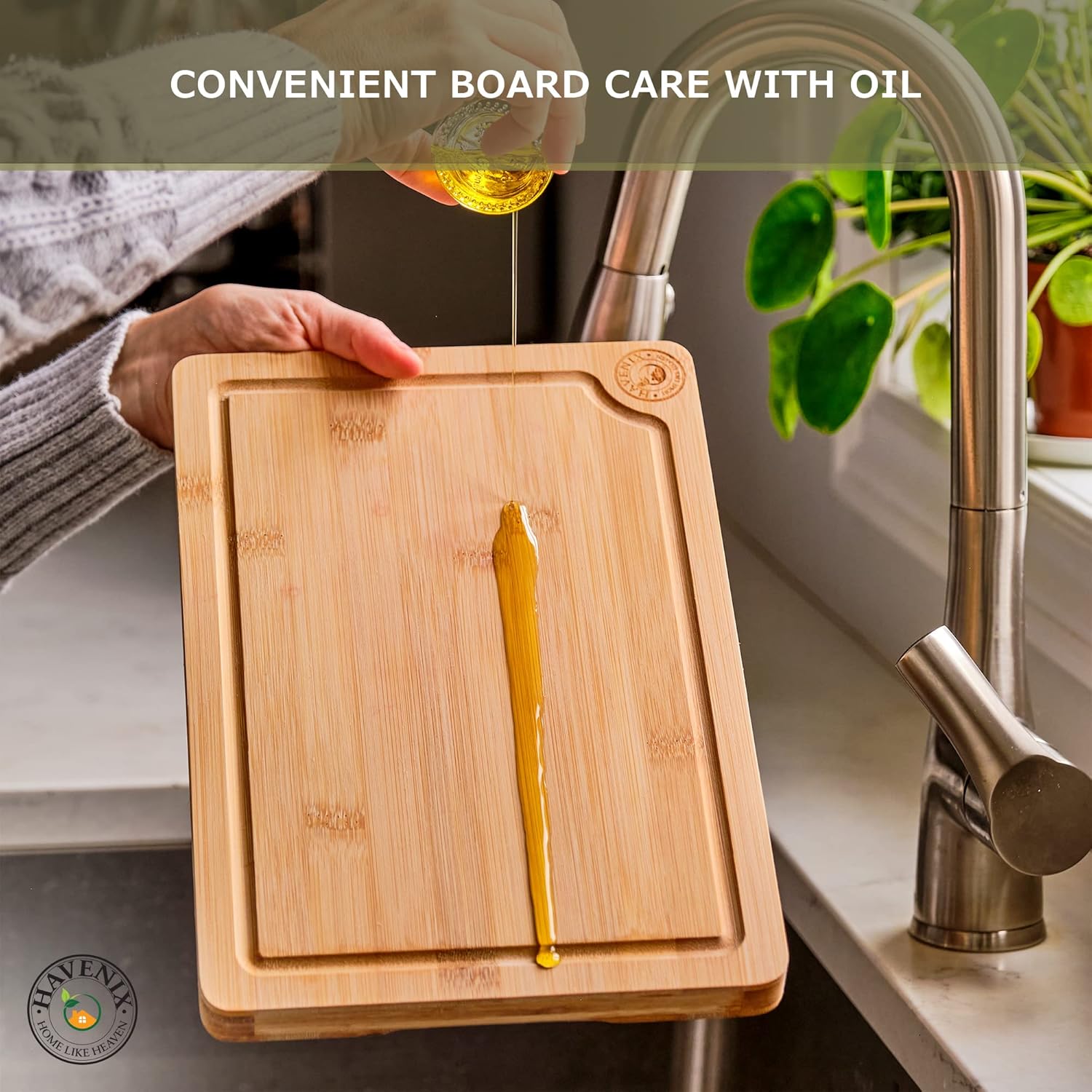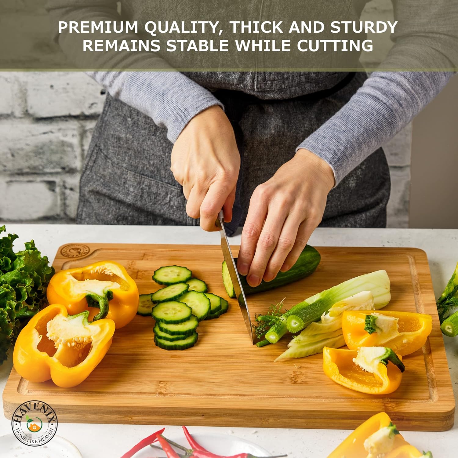 HAVENIX Bamboo Cutting Boards are Easy to Use, convenient to move and store, and comfortable to carry due to Engraved Grooved Edges that can perfectly hold juices released during chopping hydrous vegetables, fruits, and meats.