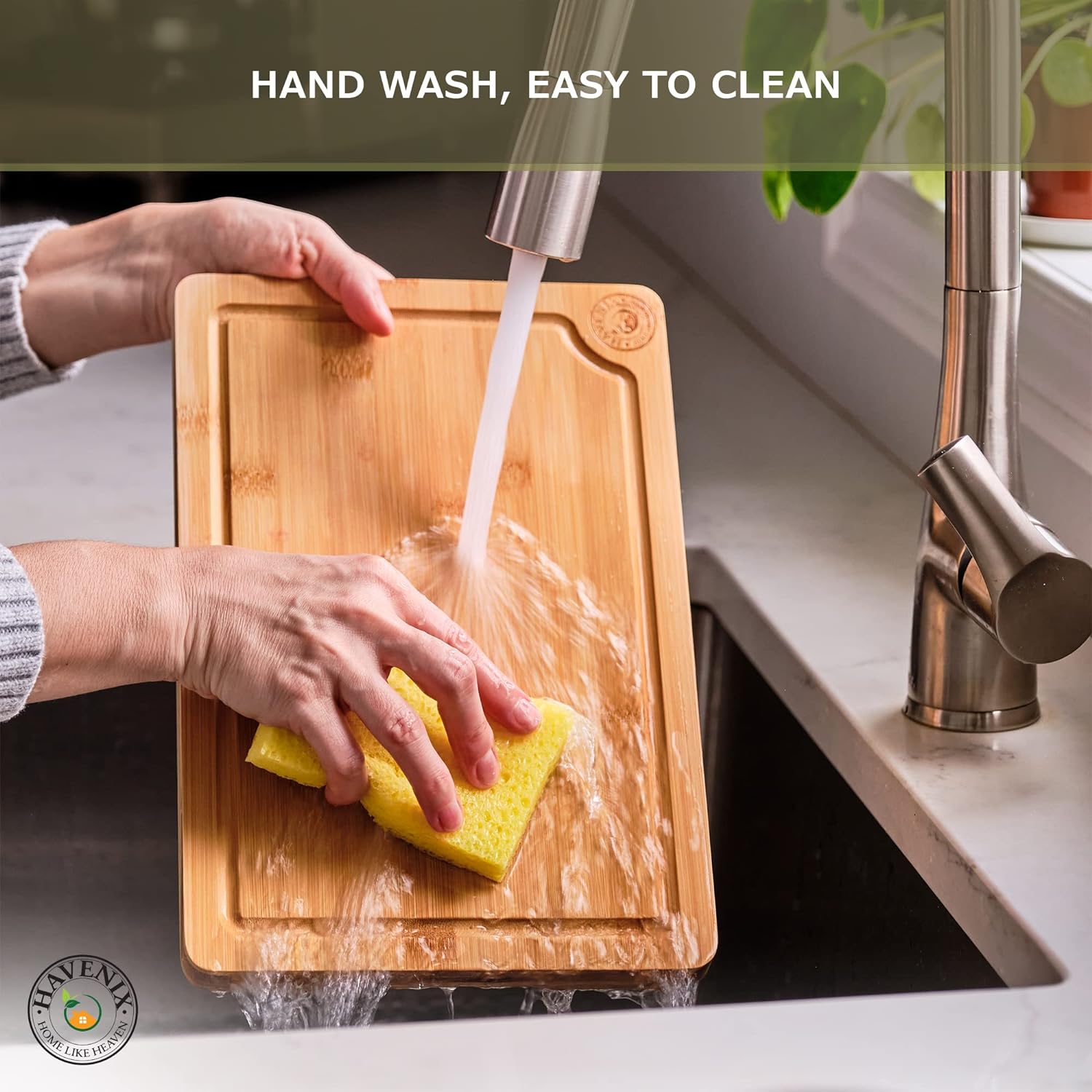 The reason HAVENIX Bamboo Cutting Boards have gained popularity in recent years is that they are almost maintenance-free due to the hardness of the wood & Easy to Clean.