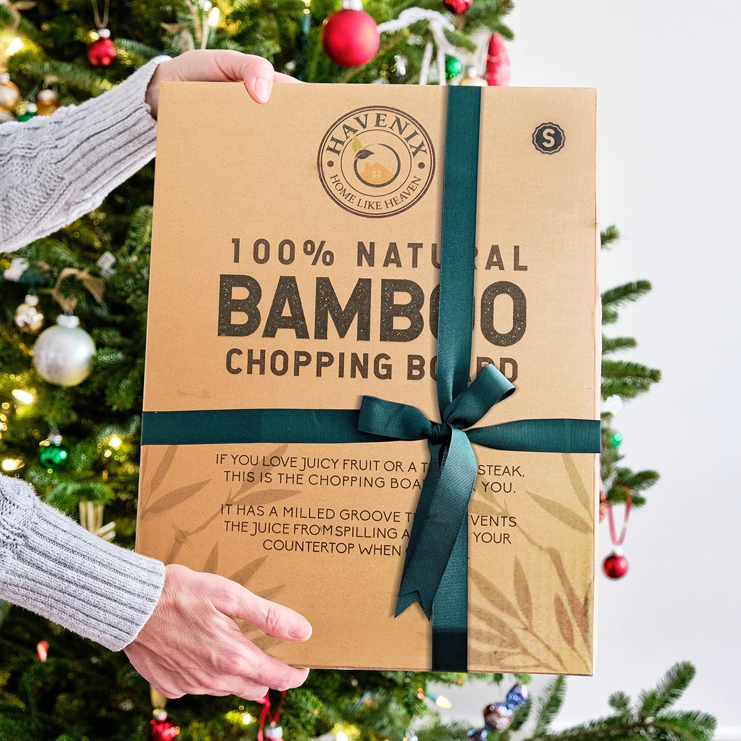 HAVENIX Bamboo Chopping Board Wood is an appealing Home and Kitchen Gift Set with appealing Packaging. This can be an elegant, thoughtful, and Unique Kitchen Set Idea for Food Lovers such as a Christmas Gift, Birthday Gift, Bridal Shower Gift, Wedding Gift, Anniversary Gift, New Year Gift, Mother’s Day Gift, and Housewarming Gift. It’s designed to meet all chopping needs.