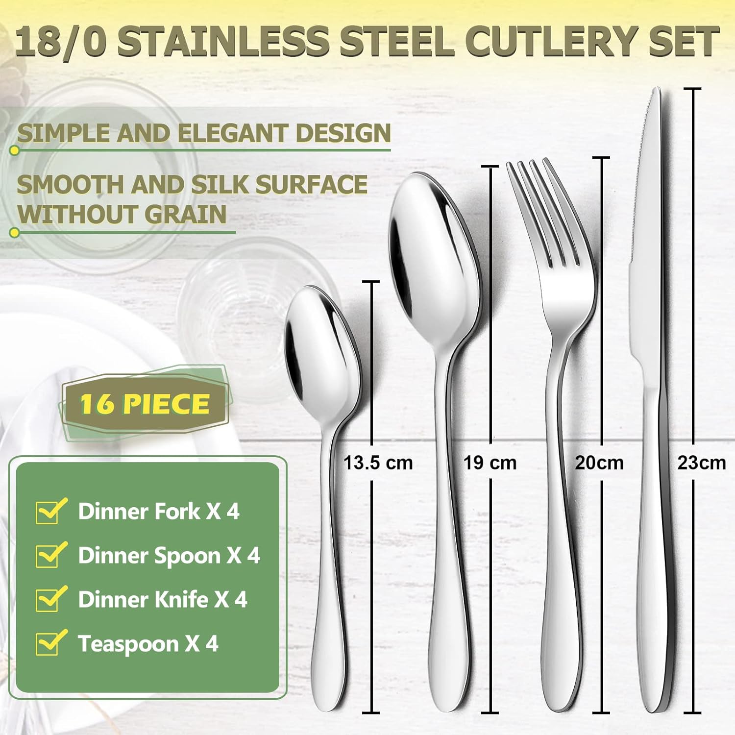 CUTLERY SET SERVICE FOR 4: HaWare 16 pcs cutlery set includes 4 dinner knives, 4 dinner forks, 4 dinner spoons and 4 teaspoons, Appropriate for special occasions or everyday meals