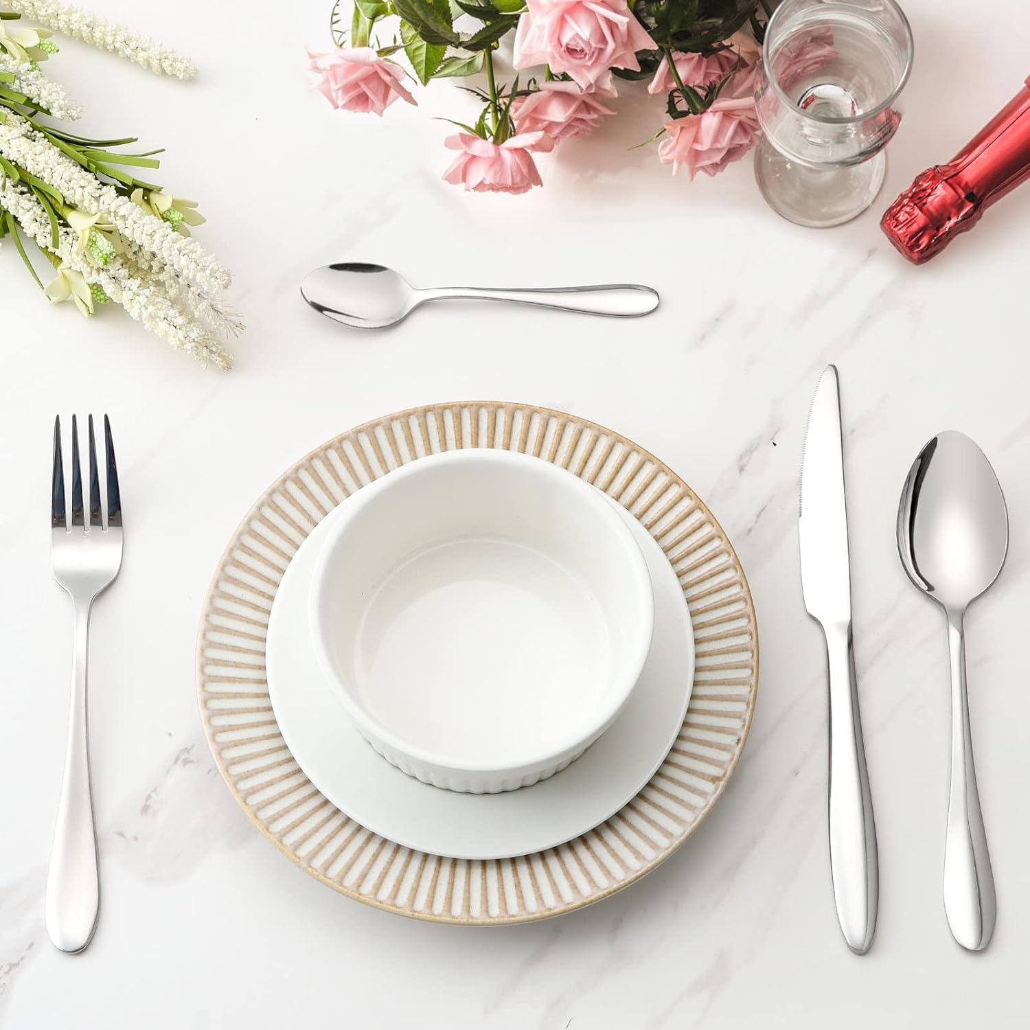 MODERN & SIMPLE DESIGN: Simple but elegant popular look, no patterns to match any occasion, Mirror finish enhancing the look and style of your meals, Unique drip handle design makes tableware set luxury and stand out
