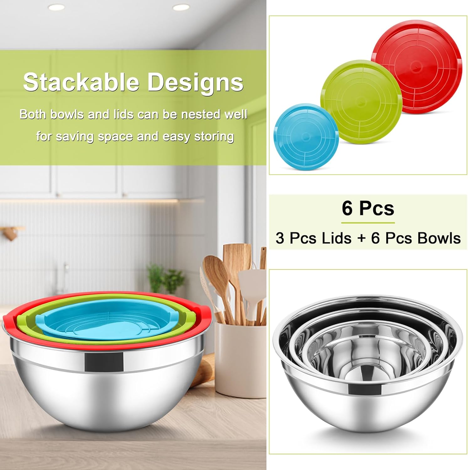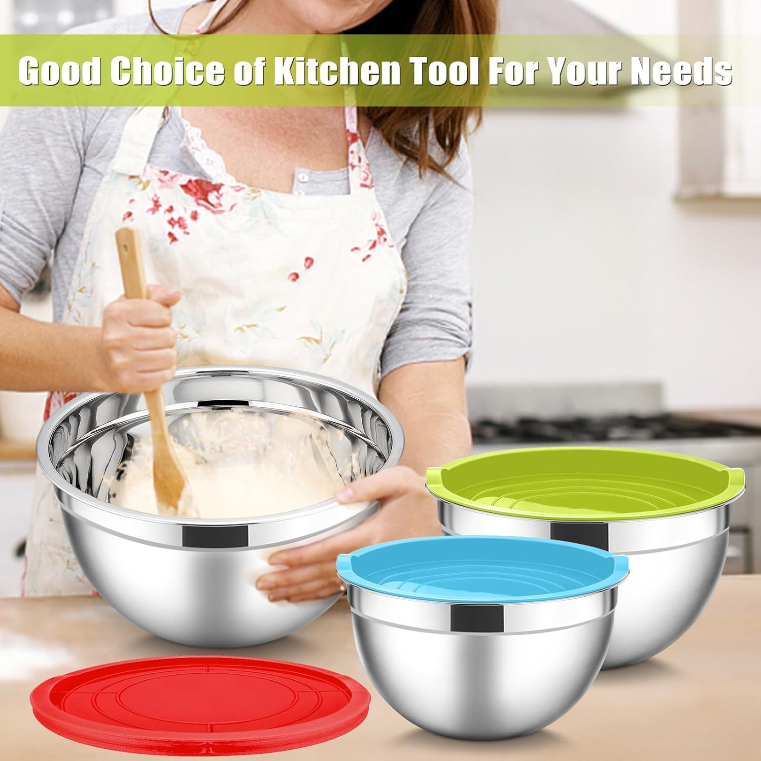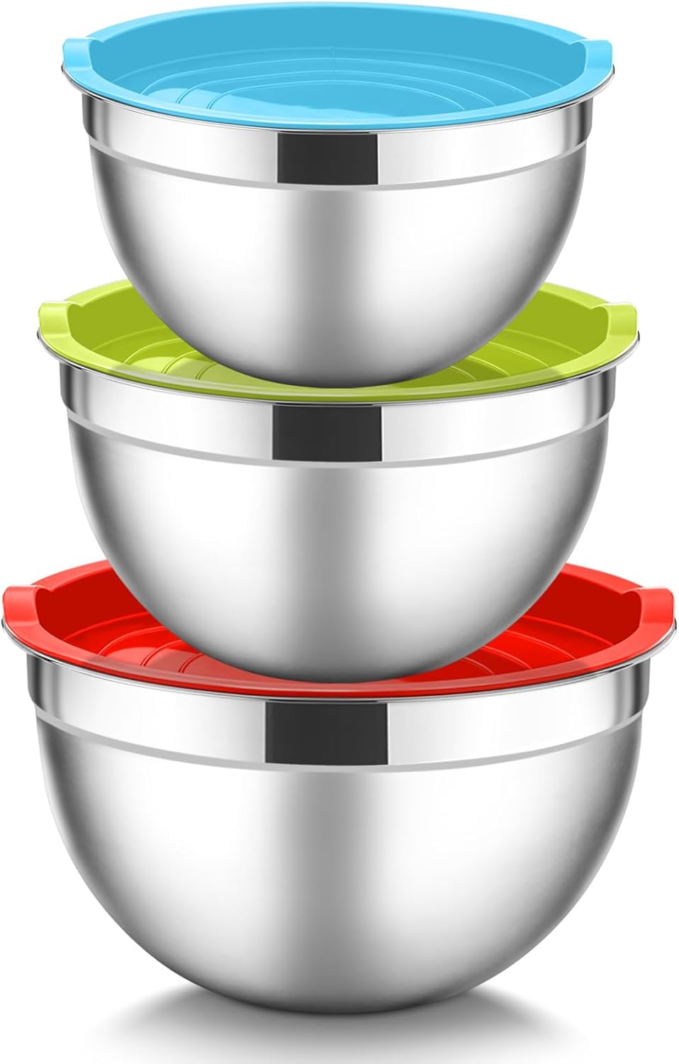 HaWare 3 Piece Stainless Steel Mixing Bowl Set. This mixing bowl set, is made of premium stainless steel without other toxic materials. Each bowl comes with a tightly sealed plastic lid to seal food fresh in the fridge and prevent dust.