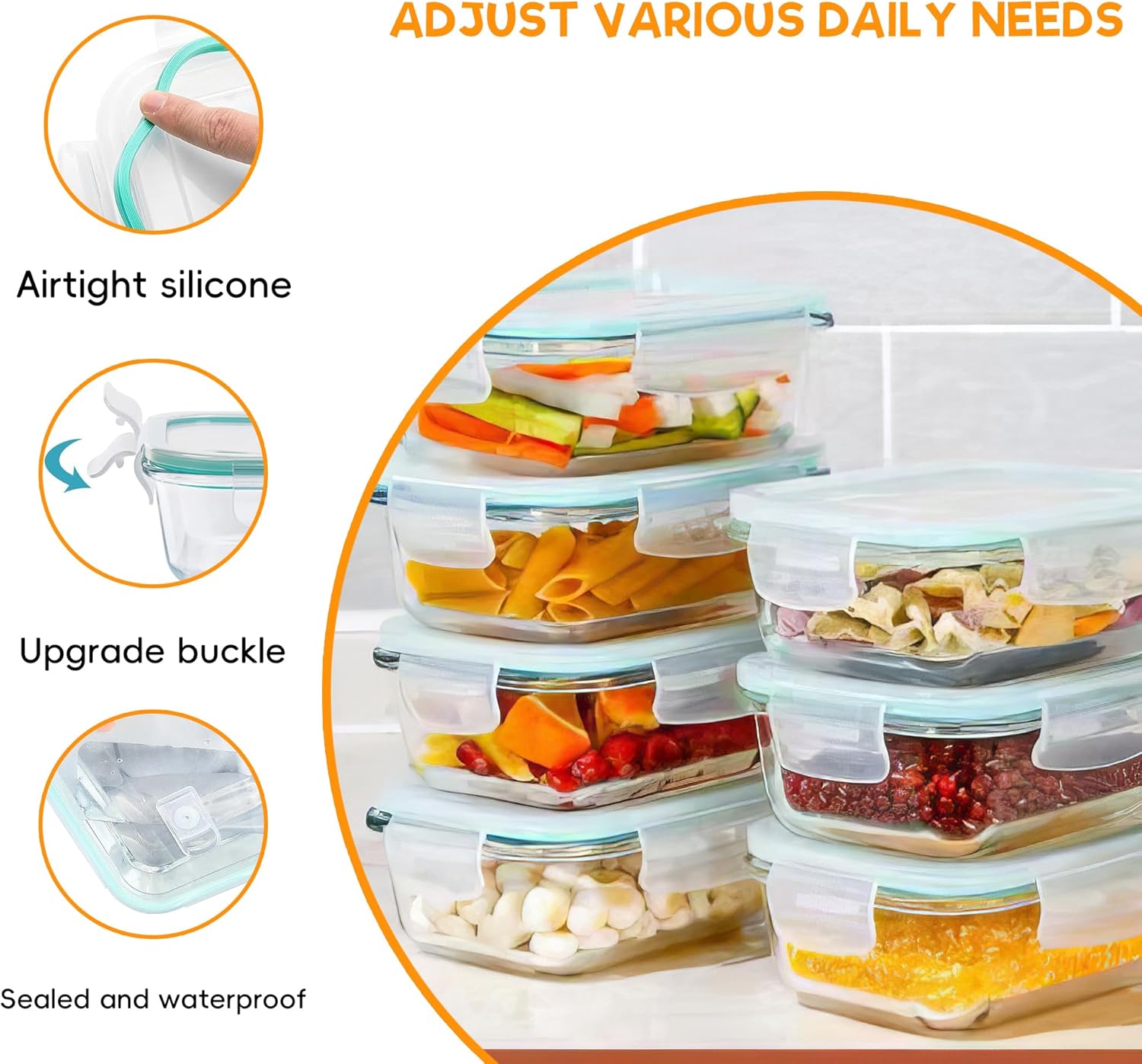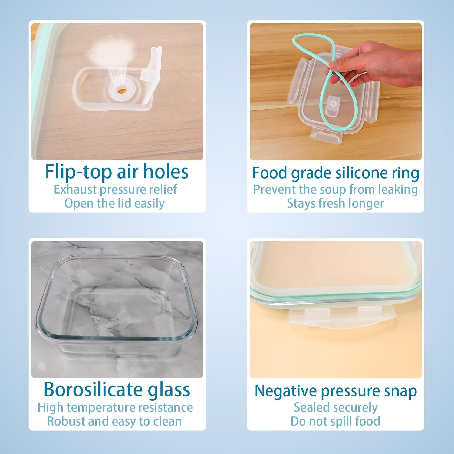 BreIt Use: Ldeal to keep all kinds of food fresh. glass food containers with lids ensures kei taste transfer between foods. Perfect for refrigeration, microwave or even freezing. Vapour Valve, Mechanism to regulate temperature differences and prevent air condensation. The valve prevents the accumulation of water vapour inside the container to prevent food from becoming soft, drying out or losing flavour.