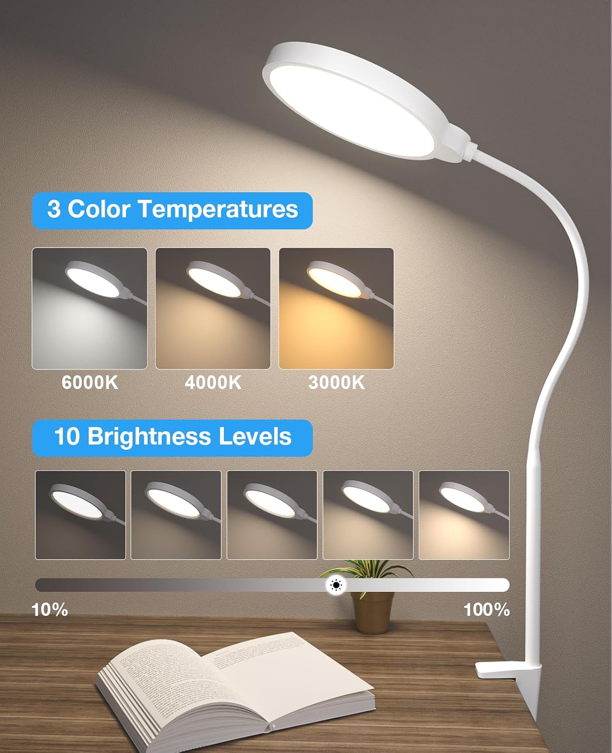 Hensam LED Desk Lamp,Dimmable Table Lamp,Gooseneck Desk Lamp for Home,Office,Reading,Study,Drawing,Desk Lighting,10 Brightness Levels & 3 Color Temperatures,Clip on Lamp,Adjustable Desk Light,White