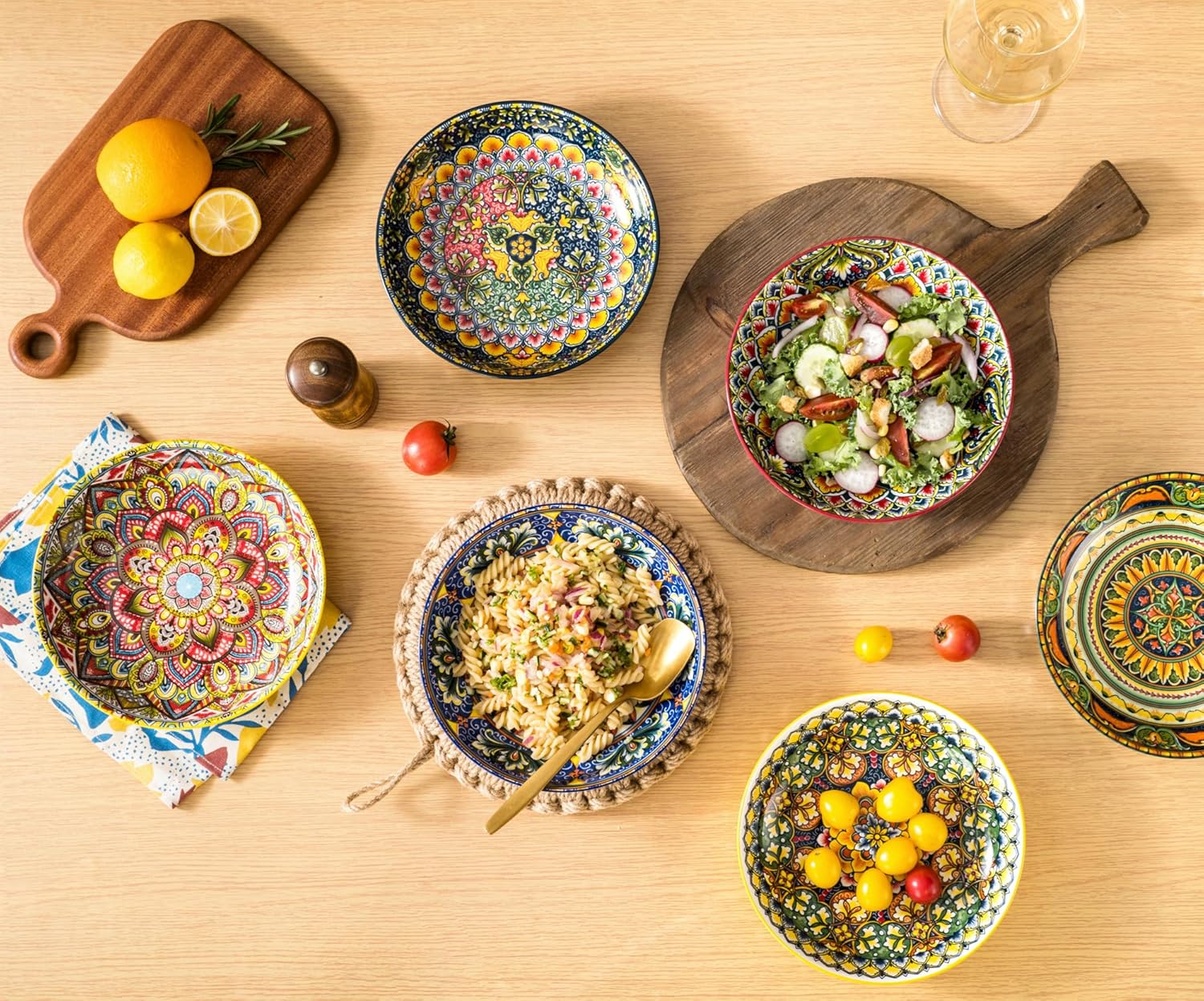 Henten Home Porcelain Salad Bowl, Pasta Bowls Ceramic 950ml – 32 OZ, Porcelain Dessert Bowl Ramen Bowl for Fruit Salad/Pasta/Cereal, Colourful Soup Bowl Set of 6 – Bohemian Style