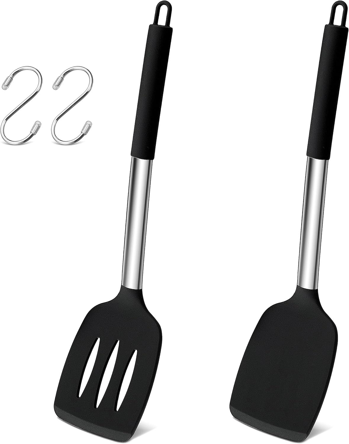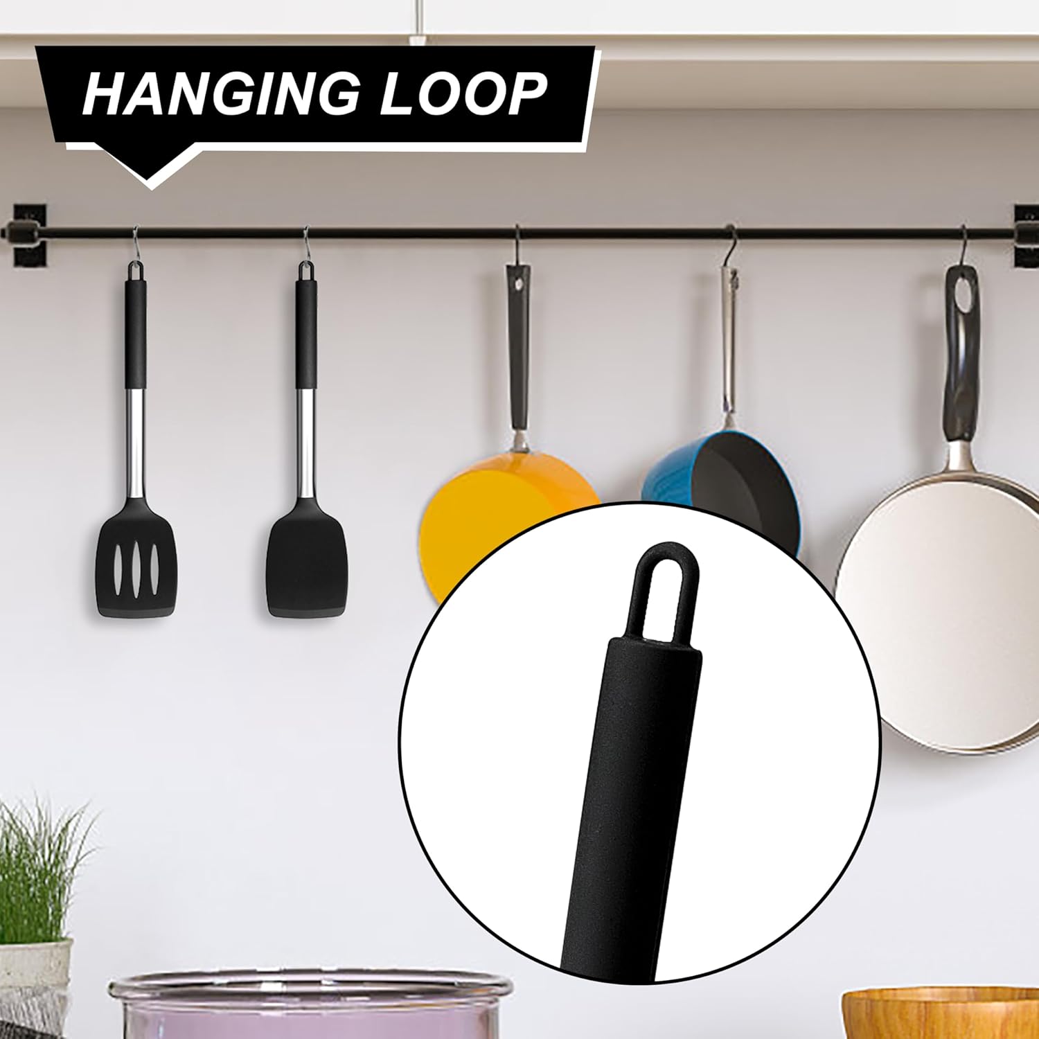 Herogo Silicone Spatula Turner, 2 Pcs Stainless Steel Cooking Spatula with S Hooks for Egg, Fish, Pancake, Meat, Non Stick Kitchen Utensils for Baking, Heat Resistant & Dishwasher Safe, Black