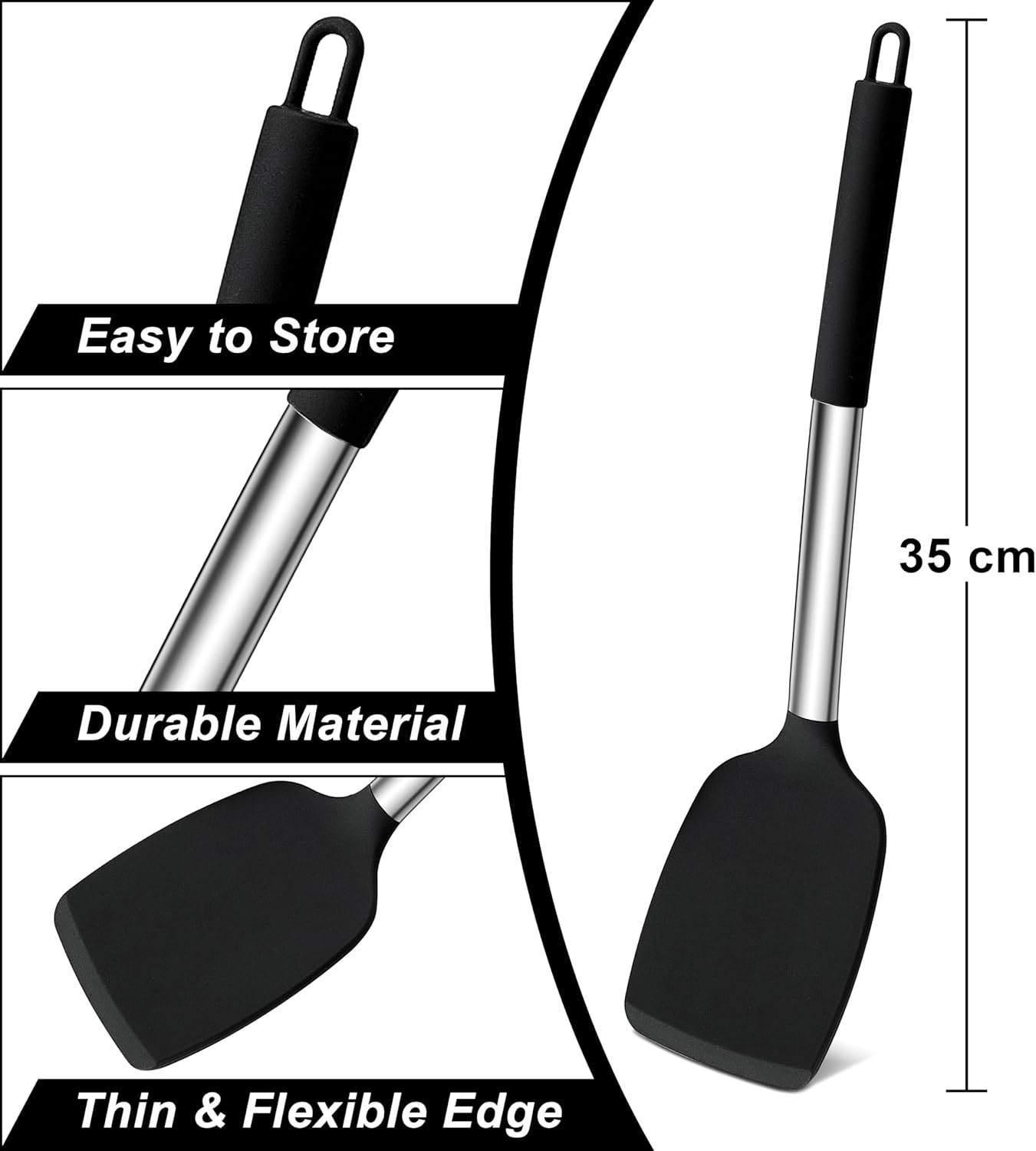 [EXCELLENT DESIGN] Made of high quality stainless steel handles, the handles are designed with ergonomics in mind for a more comfortable grip. Food-grade silicone will not react with food or drinks, so you and your family will always be healthy and safe. The soft silicone will not scratch your non-stick pans and will extend the life of your kitchen gadgets.