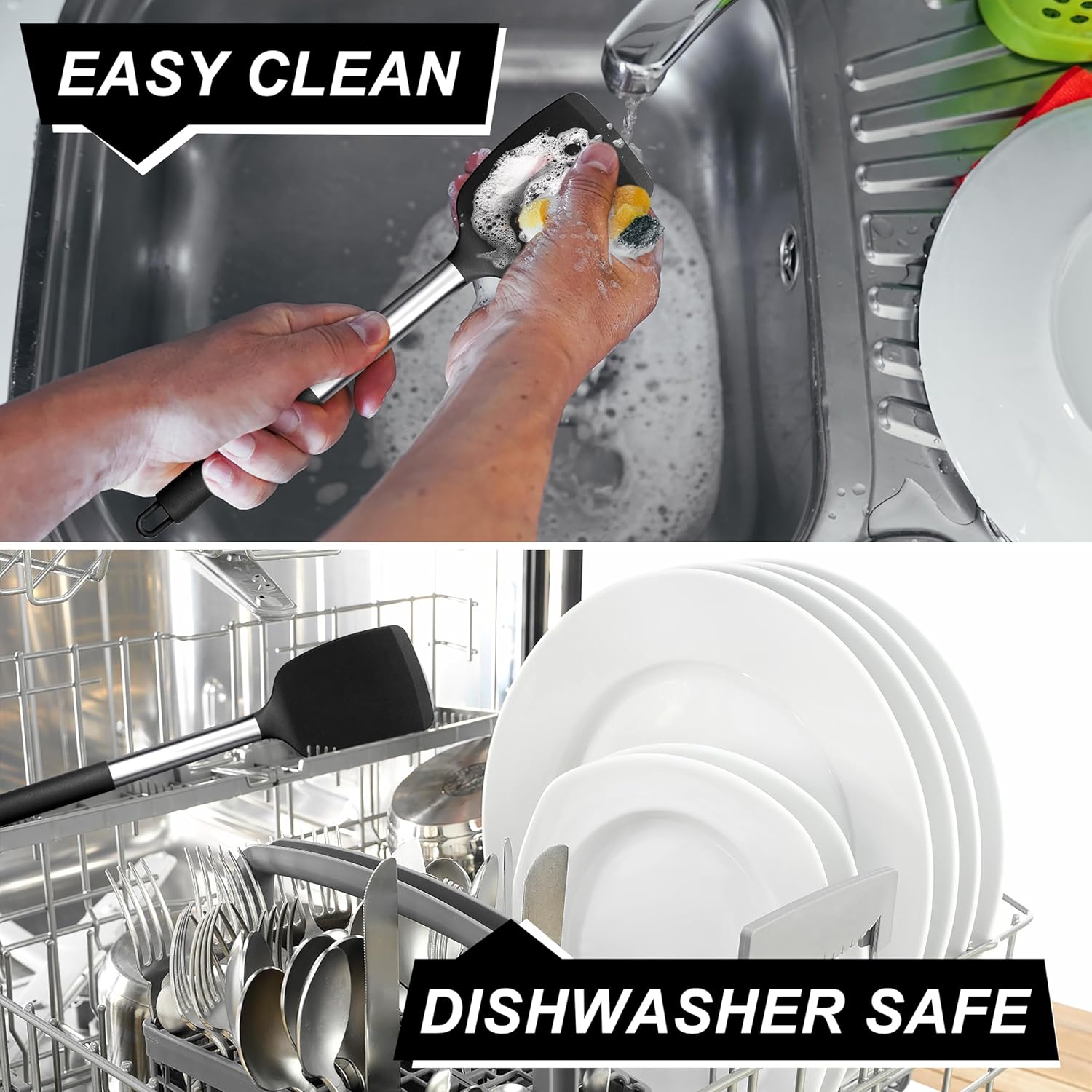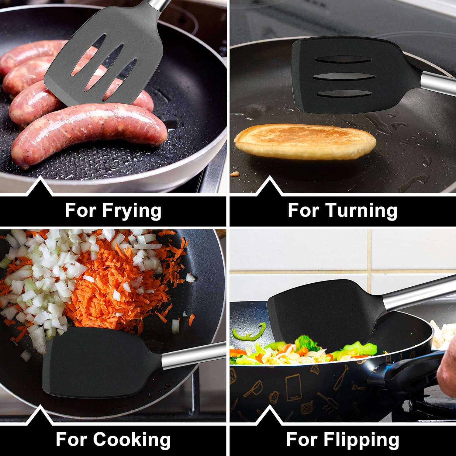 [DURABLE & HEAT RESISTANT] This cooking spatula set can withstand temperatures up to 500 °F (300°C) without melting, so it protects your hands from burns in high temperature environments, and the stainless steel handles are sturdy and will not rust compared to wooden cookware, so they won’t chip, twist, melt, break, or cause other damage.