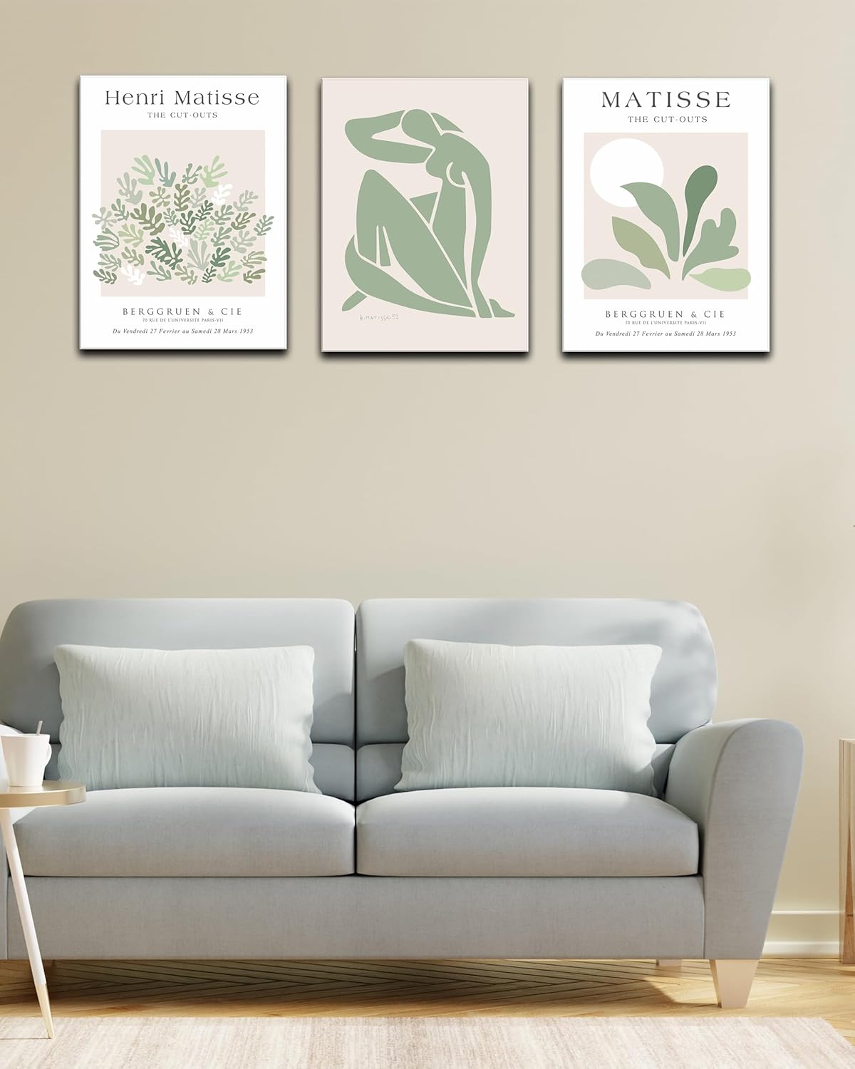 HesenDot Sage Matisse Wall Art,Green Framed Wall Art Set of 3,Minimalist Botanical Wall Art Decor,Truly Quality Canvas Prints for 30x40cm,Art Poster Decoration for Kitchen,Bathroom,Living Room,Bedroom