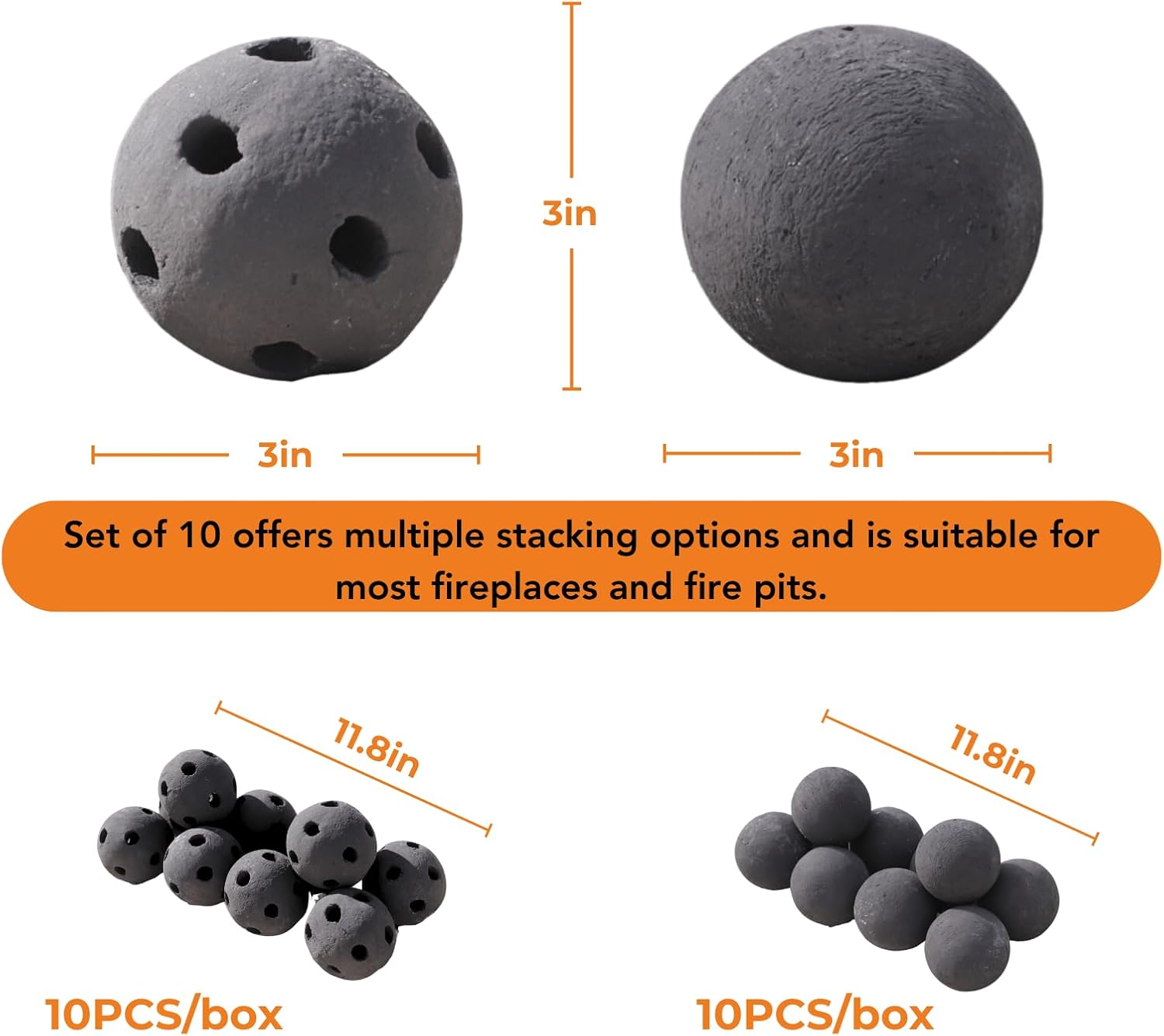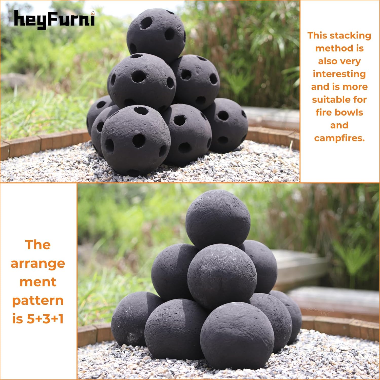 The fire come through the holes of the balls. These fun little balls, they are in size 7cm, we prepared 10 of them, this size is just right to fill most fireplaces and fire pits, they are not flashy but very calm, and they will greatly increase the fire when you light it. The heavy feeling makes people feel safe and warm