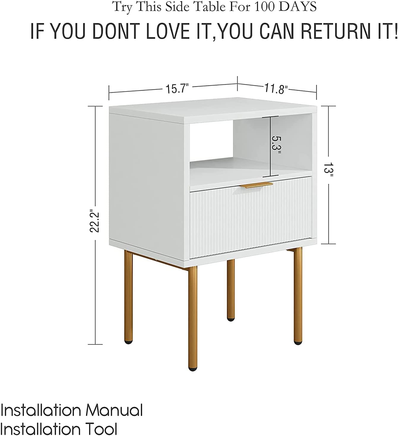 The nightstand is amazing at first glance. The combination of white panel and golden frame, beautiful lines and textures make the whole bedside table full of modern vibe. Put it on the side of the bed, put a beautiful vase or photo frame, the whole bedroom becomes different, the elegant vibe fills the whole room, and the mood is relax. The large space storage function makes you no longer worry about where to put glasses, water cup before going to bed, where to put books, and where to put some messy necessities of life. A desk lamp, a water cup, everything is so neat and perfect. It is not limited to the head of the bed. Its beautiful style makes it very suitable as a sofa side table, coffee table, accent table etc. In the living room, place a side table like this, grind a cup of coffee, and pick up a book , the happy life begins here.