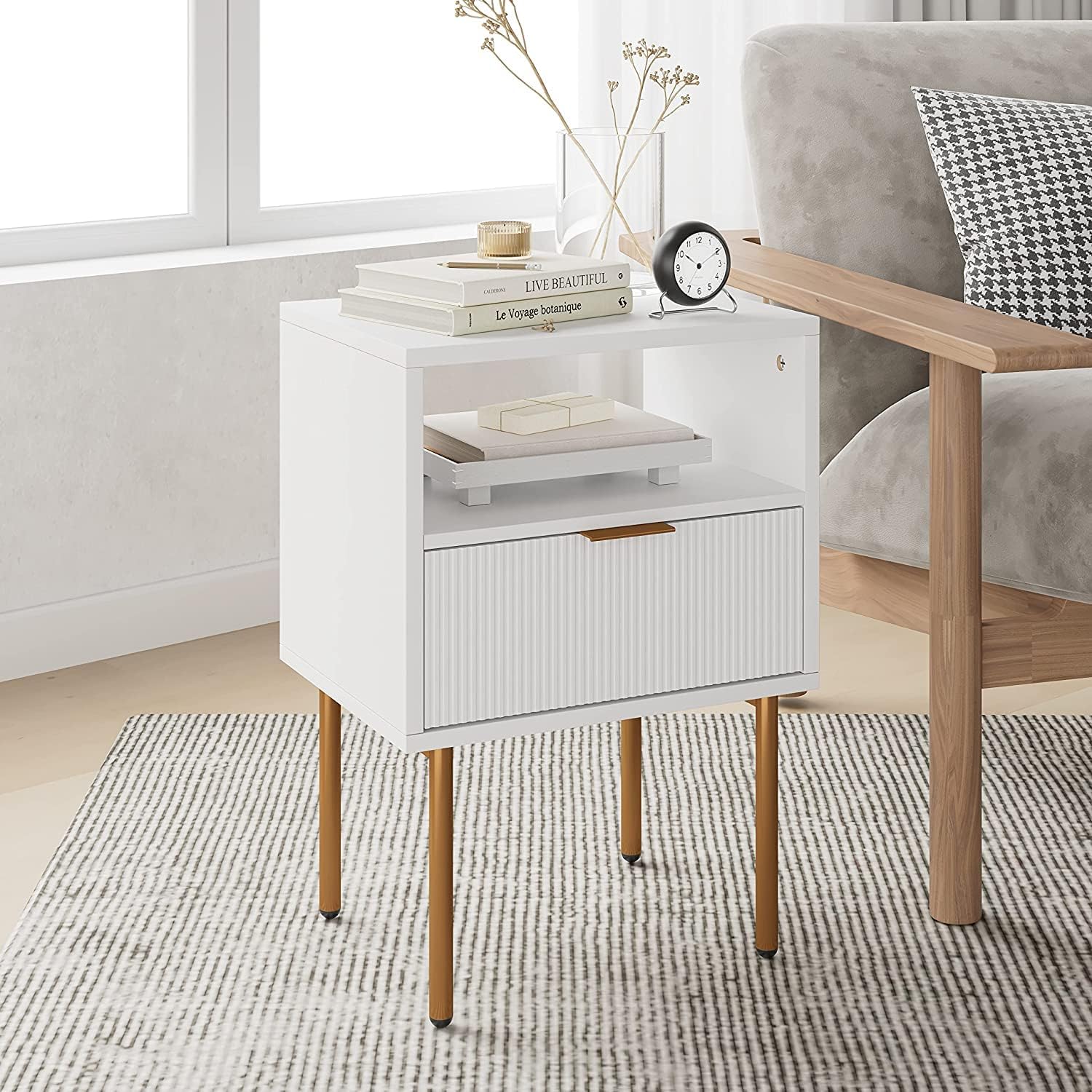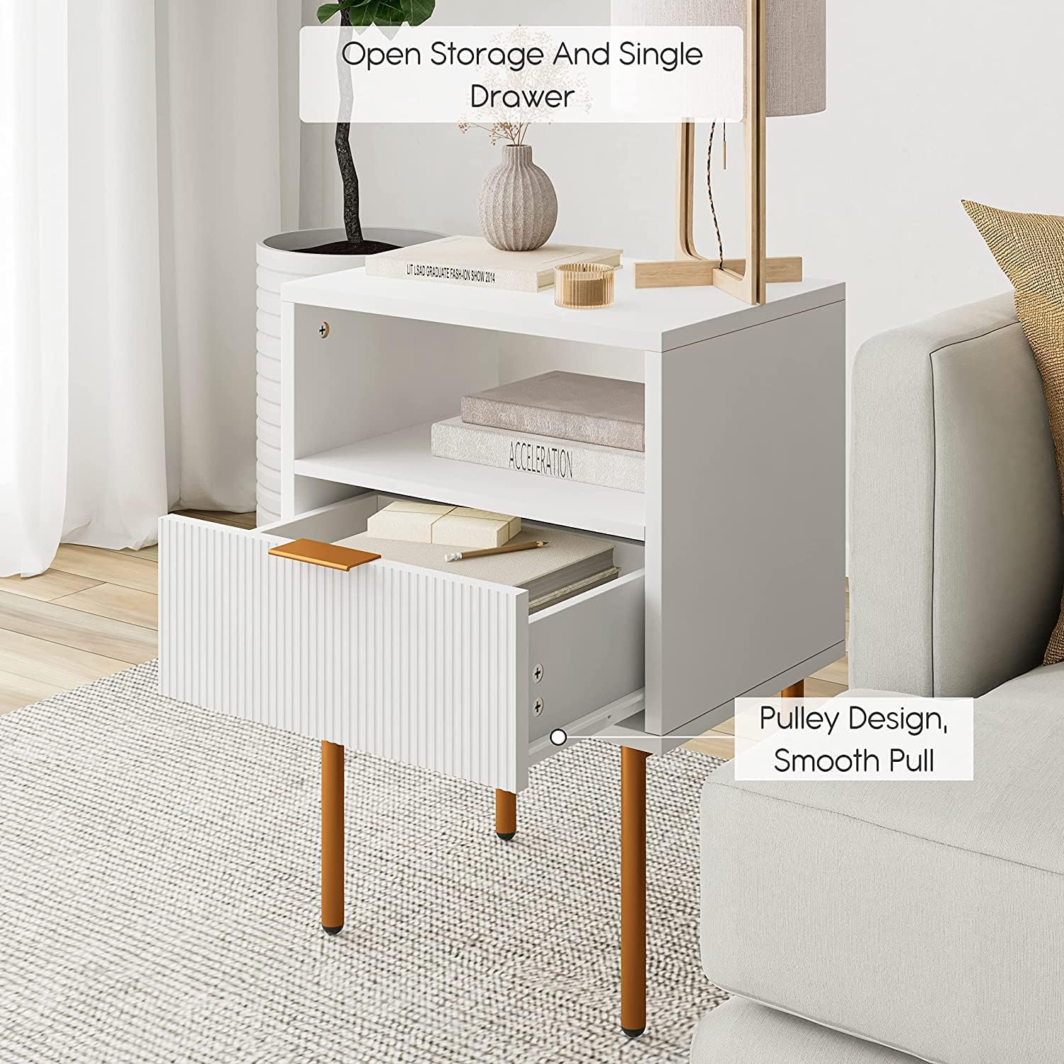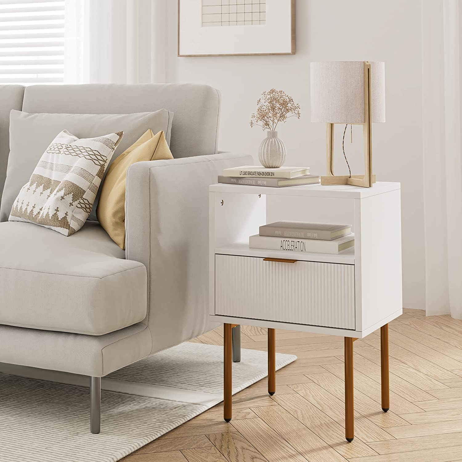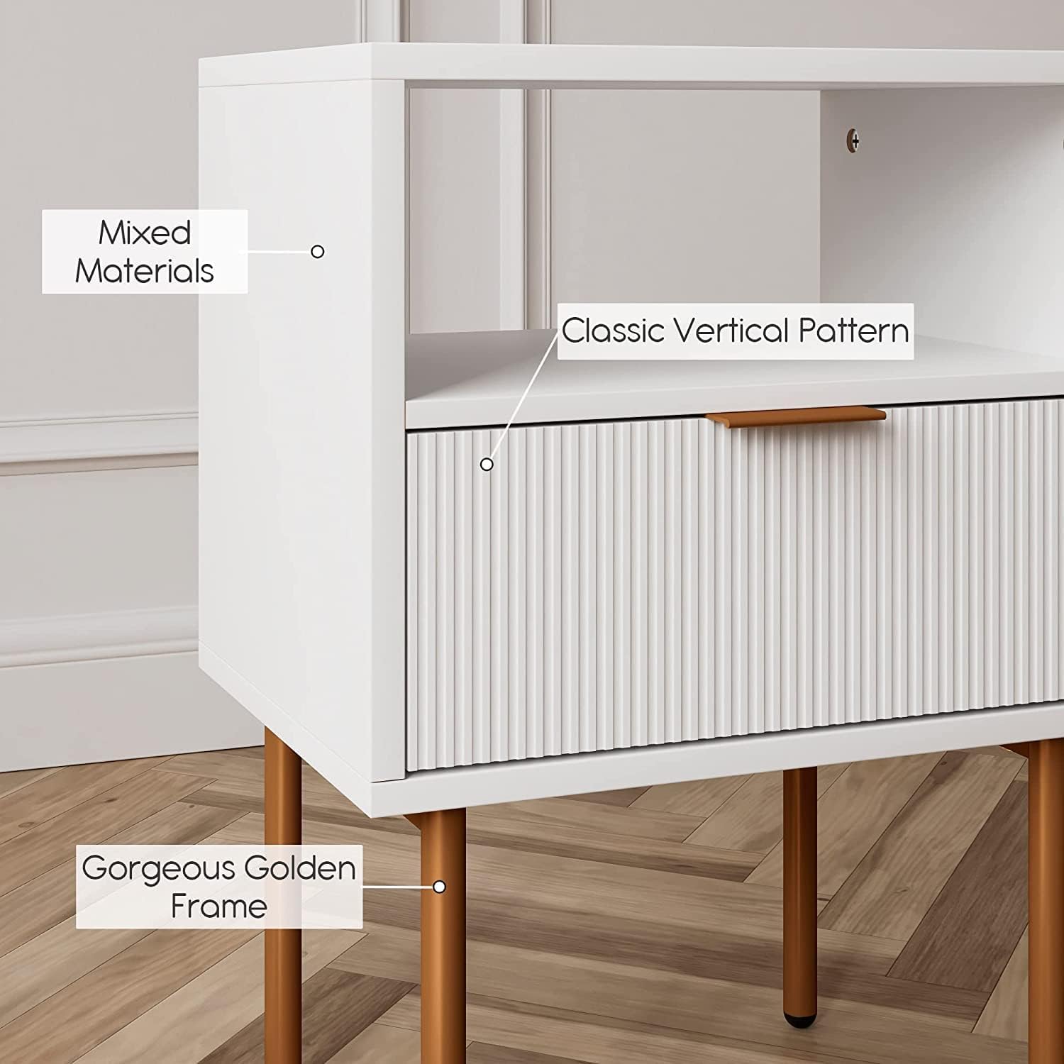 Sleek and Elegant Design: The combination of gold legs and a white wooden bedside cabinet exudes a sense of sophistication and modernity. lts sleek lines and minimalist design effortlessly complement various interior styles, adding a touch of elegance to your home space.