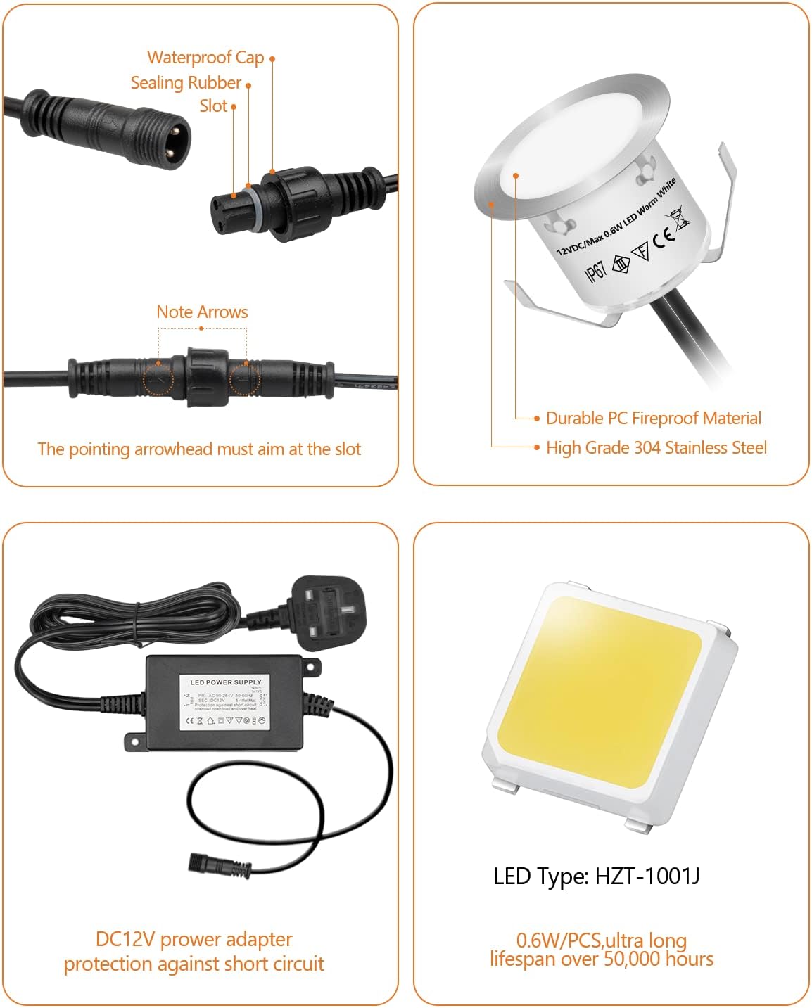 【IP67 Waterproof】IP67 effectively prevents rainwater from entering the lamp, made of high-quality acrylic/ABS and 304 stainless steel, the lamp body and power supply are filled with glue, fully insulated and waterproof, safe for indoor and outdoor use.(if need extension cable for the deck lights can search in ASIN:B09Y1SDQVH)