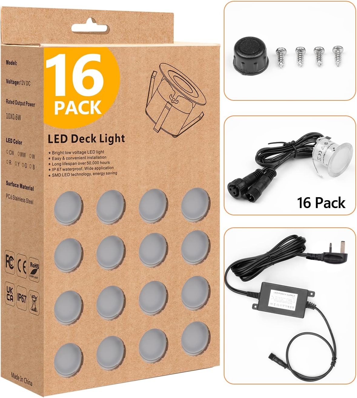 HIBOITEC 16Pcs Decking Lights, Lighting LED Deck Lights φ32mm, Warm White Decking Lighting, Waterproof Plinth Deck Lights, for Outdoor, Garden, Floor Tile, Staircase, Wall Corner, Bathroom