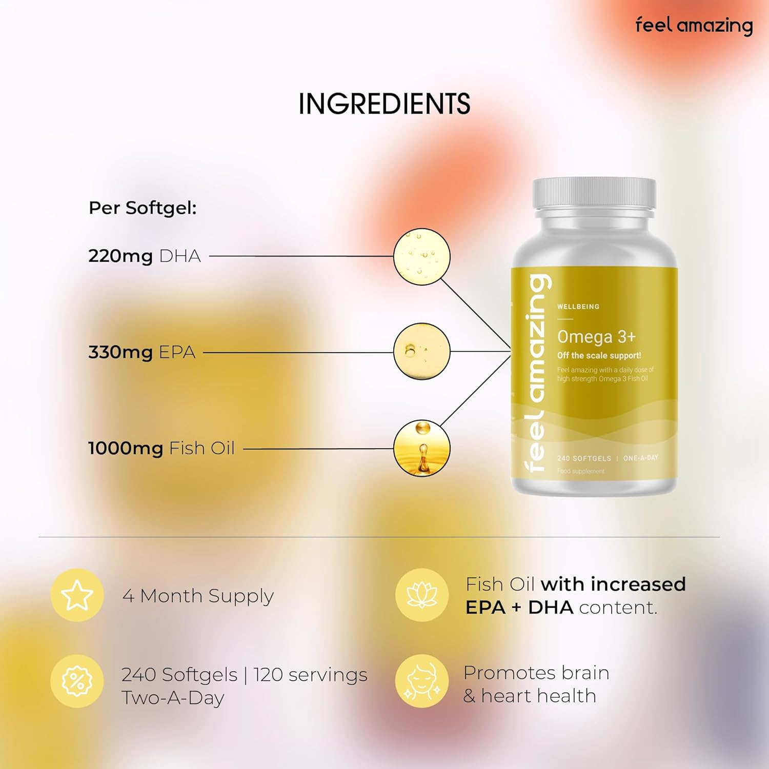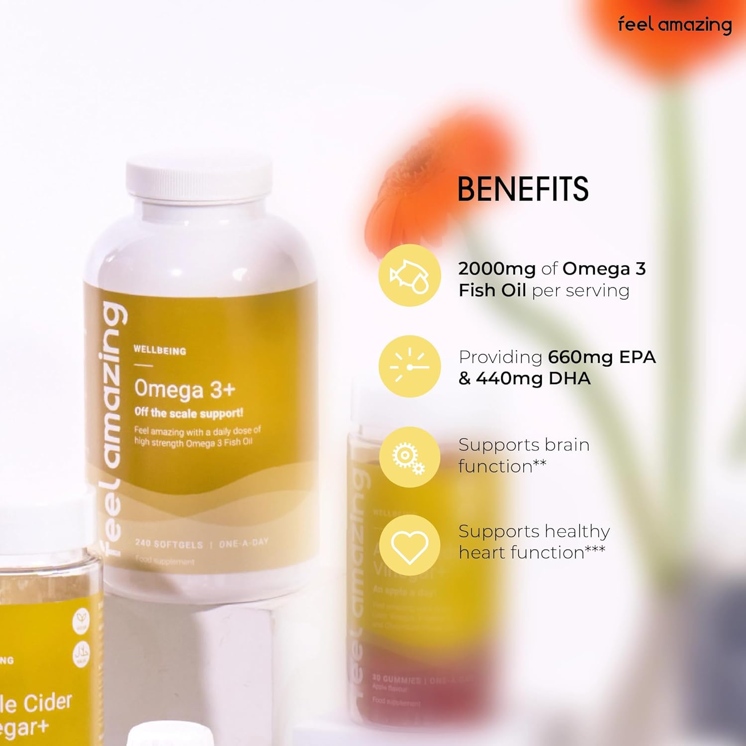 Looking for an off the scale support for your wellbeing? Look no further, try our high strength Omega 3+ Fish Oil softgesl! The solution to your daily dose of high strength omega 3 fish oil. Packed with 2000mg of omega 3 fish oil per serving of 2 soft gels, including 6600mg EPA and 440mg DHA, these softgels aid normal brain function and support a healthy functioning heart. With 240 softgels in each bottle, simply take one a day and feel amazing! Don’t miss out on the benefits of omega 3 supplements – try Omega 3+ Softgels today and embark on a journey to optimal health!
