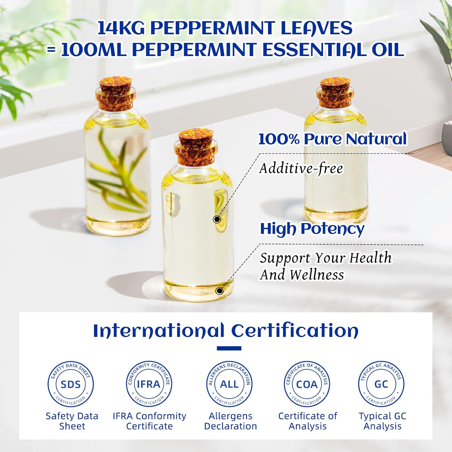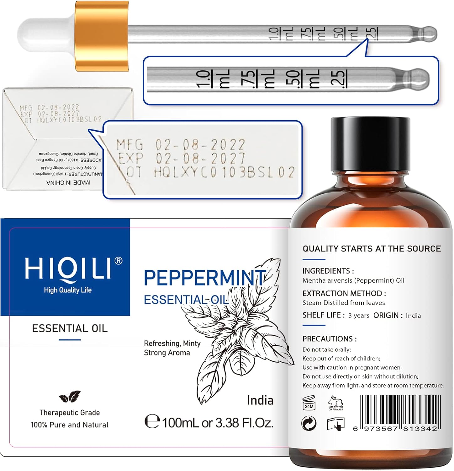 HIQILI Peppermint Essential Oil 3.38 Fl oz – 100% Natural, with Glass Dropper for Air Freshening, Cleaning, Home, Garden, Indoor, Outdoor, Skin, Hair, Facial Care, Diffuser